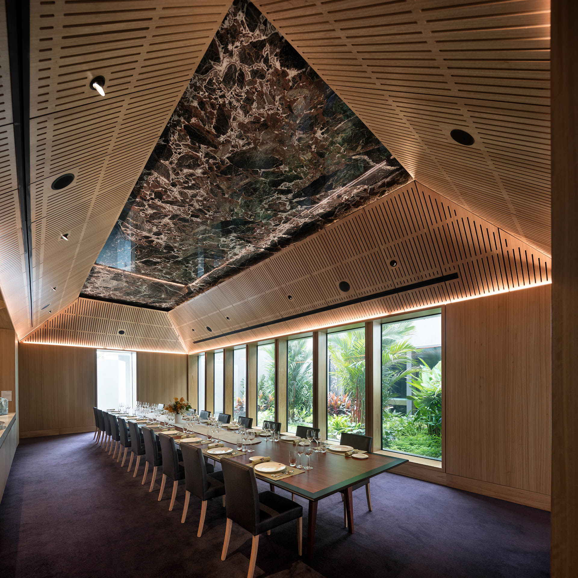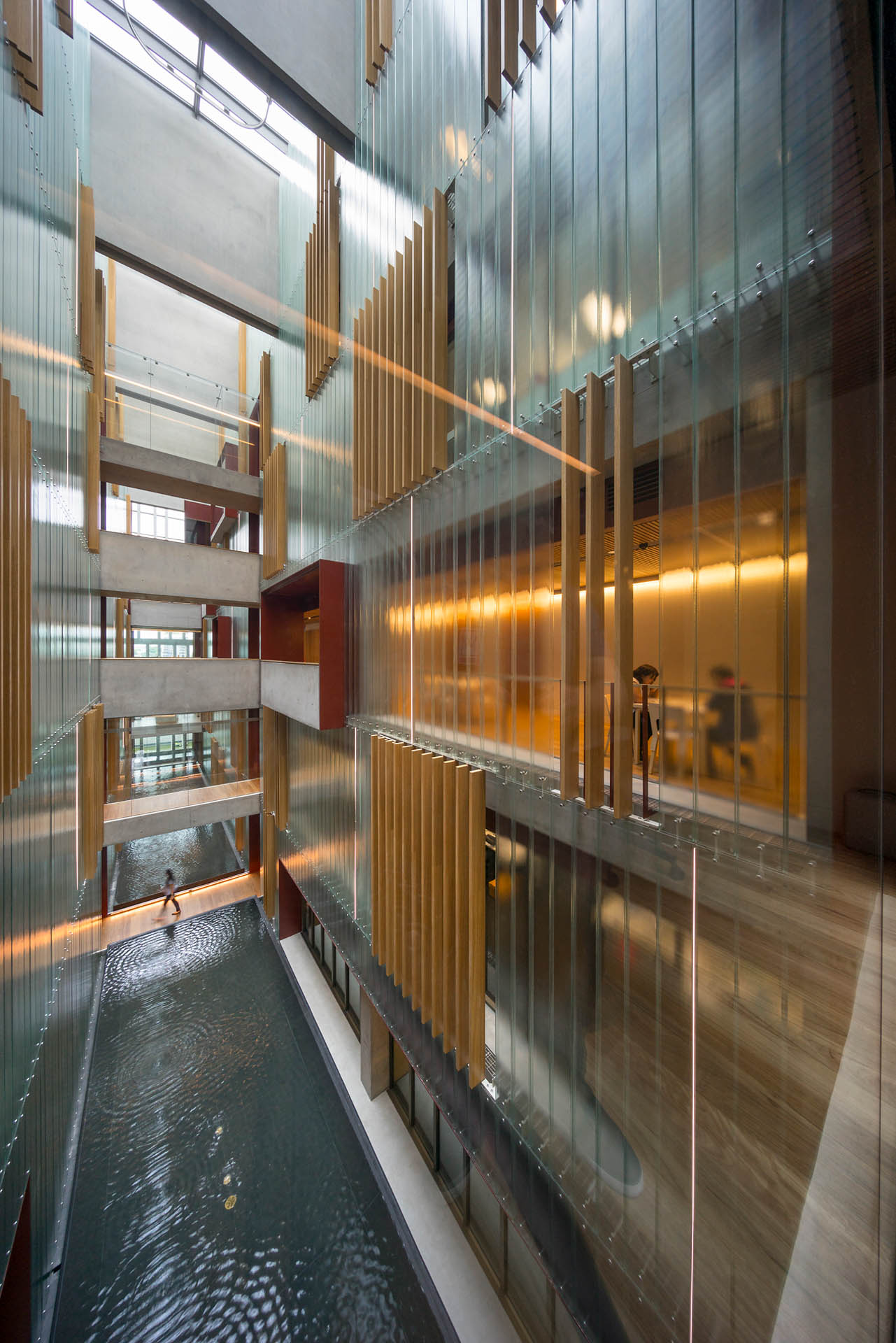 The new multi award-winning embassy also makes extensive use of Australian stone and timber, and particular features include: blast-rated bespoke glazed atrium walls and roof with slender masonry columns and clad shelfs; frameless glass bridge enclosure to level 4 of the Chancery; suspended stone ceiling to the HOM dining room; and a network of ponds for lilies, fish and turtles.