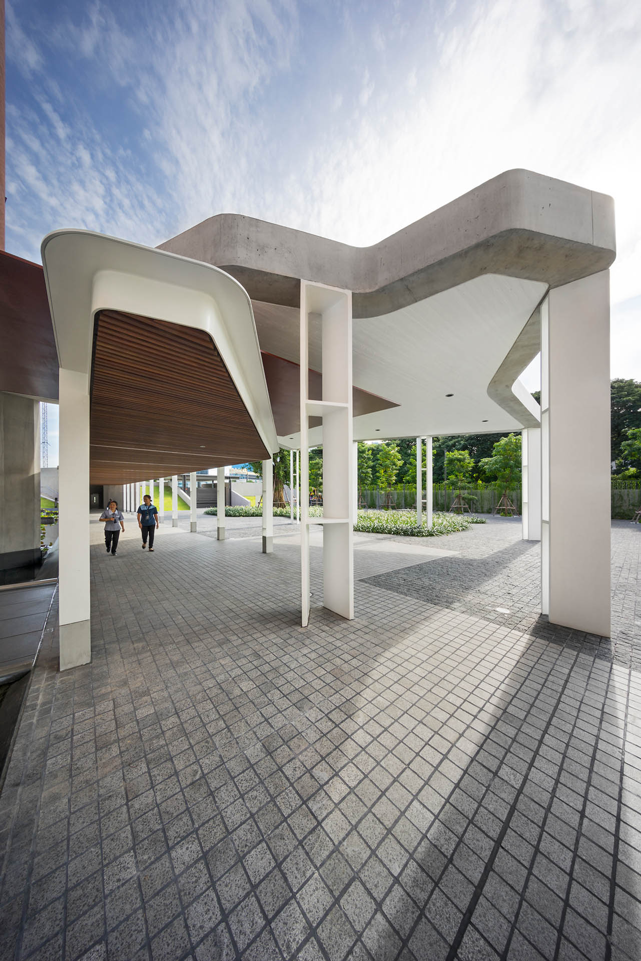 The Façade showcases a curved organic form of reinforced concrete, with punched windows and masonry cladding creating deep reveals for shading and privacy. The masonry Façade was constructed of Australian-made curved bricks, with three brick colours used to distinguish the different functions of the facility.
