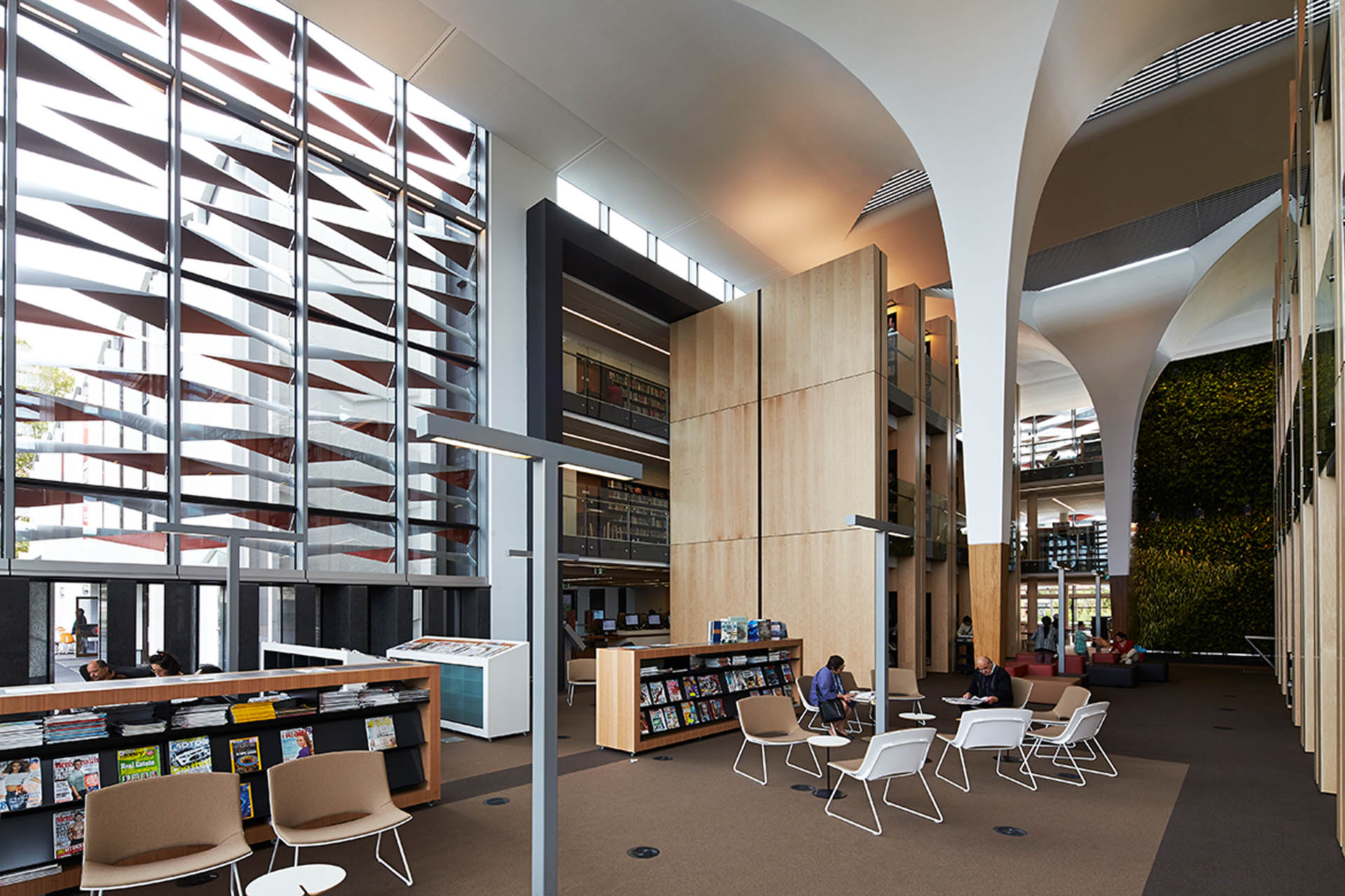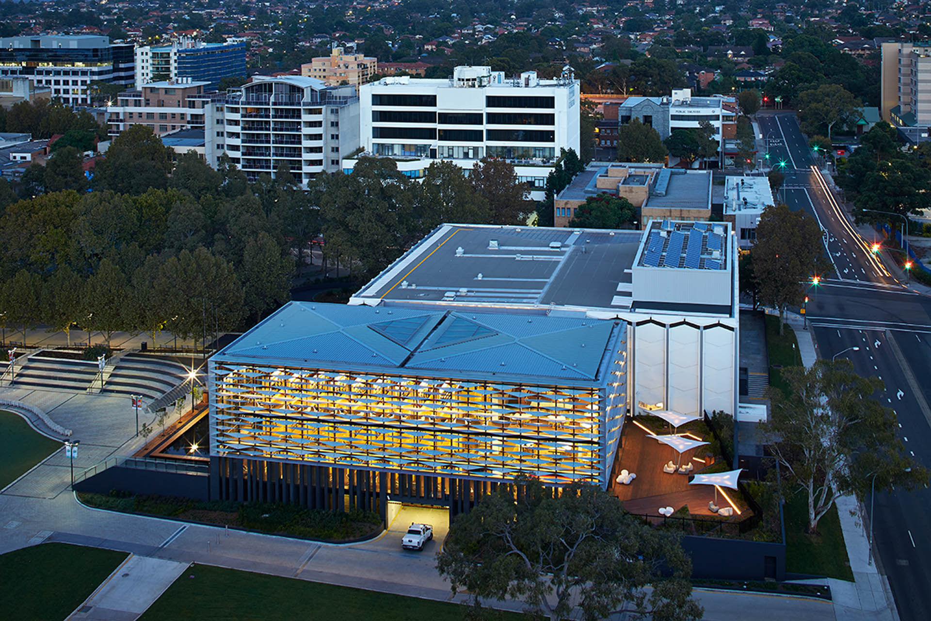 The new Library and Knowledge Centre, commissioned by the Bankstown City Council, has transformed the existing Bankstown Town Hall to an integrated, flexible, state of the art community hub and it has become a new iconic public building in the heart of Bankstown. The redevelopment includes demolition of the existing auditorium and construction a new library of three storeys including an outdoor reading garden and a new aquatic sculpture garden; renovation of the existing Town Hall to become a 300-seat theatre, conference facilities and cafeteria.