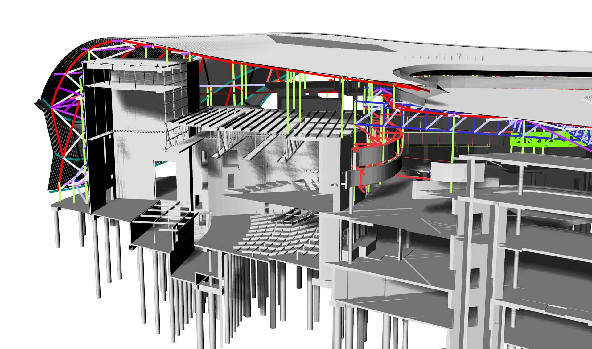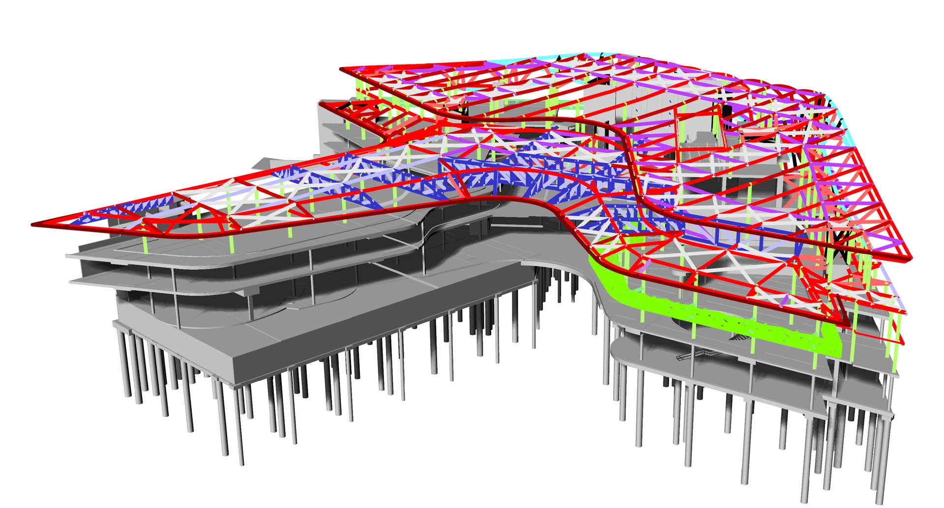 The roof form created specific challenges in the detailing of the steelwork, with complicated connections requiring finite element modelling. TTW's engineers worked closely with architects and timber contractors to optimise the timber roof form within the spatial design constraints. The remainder of the freeform roof structure is constructed of steel with spectacular cantilevers at the building edges.