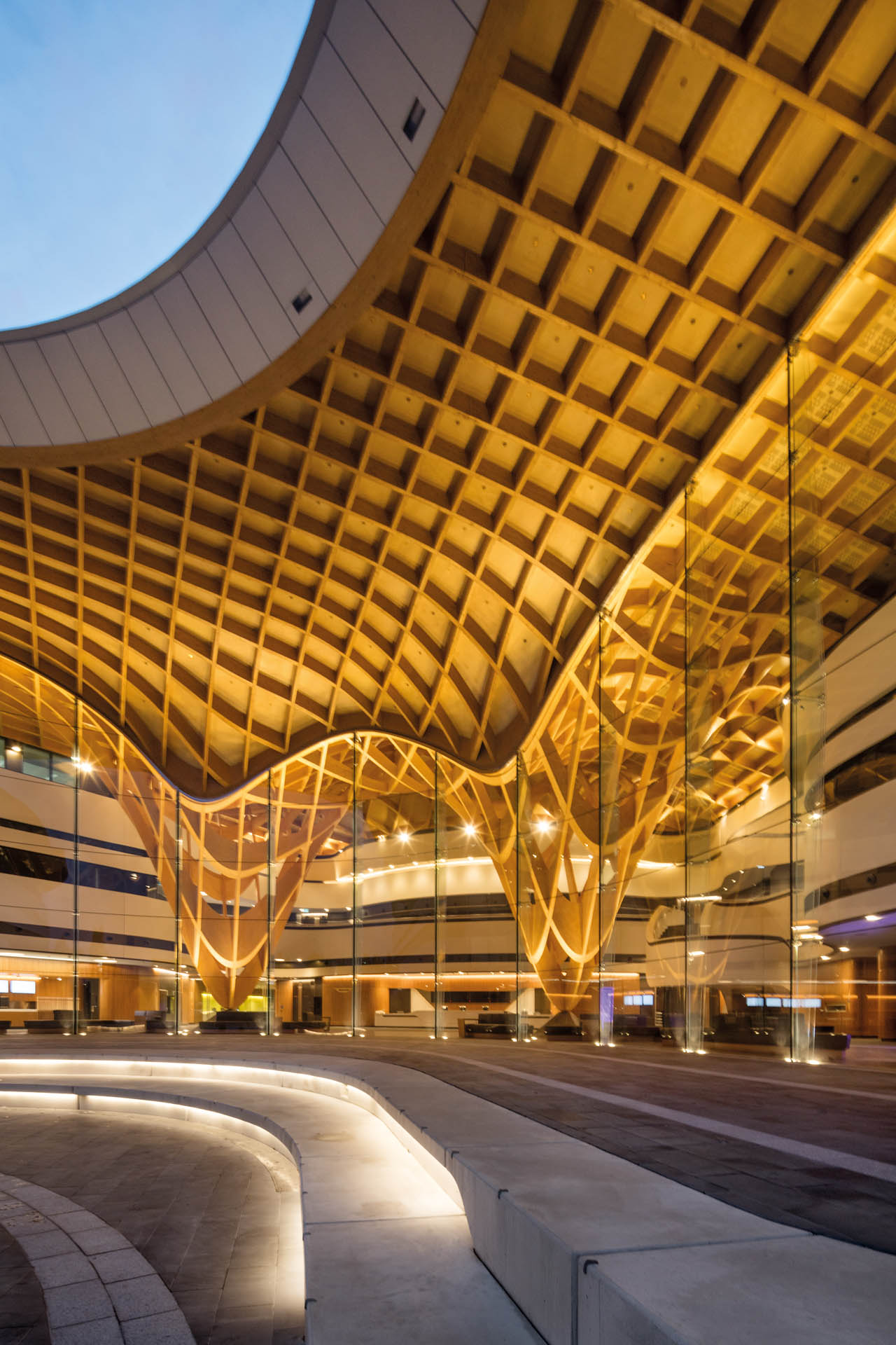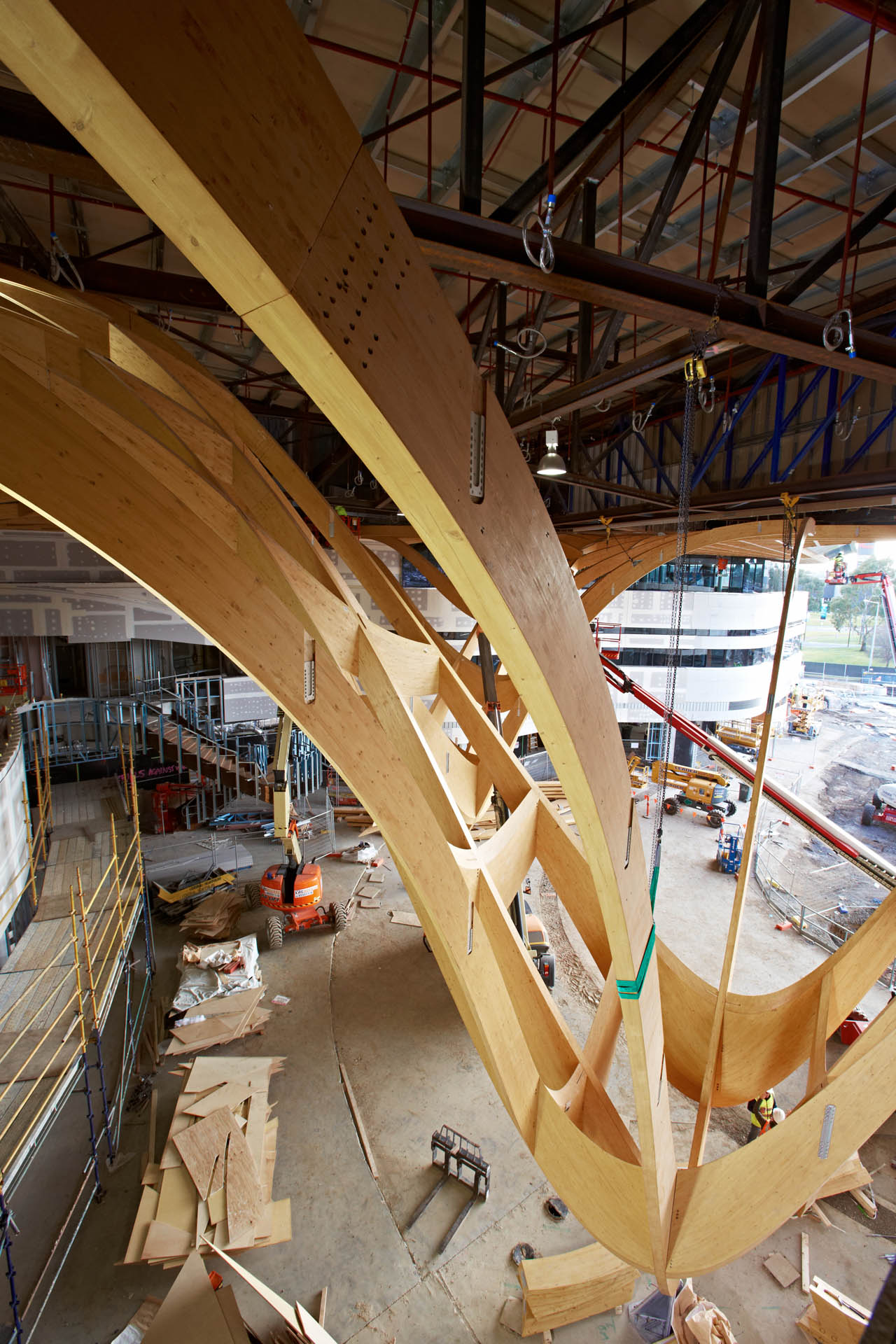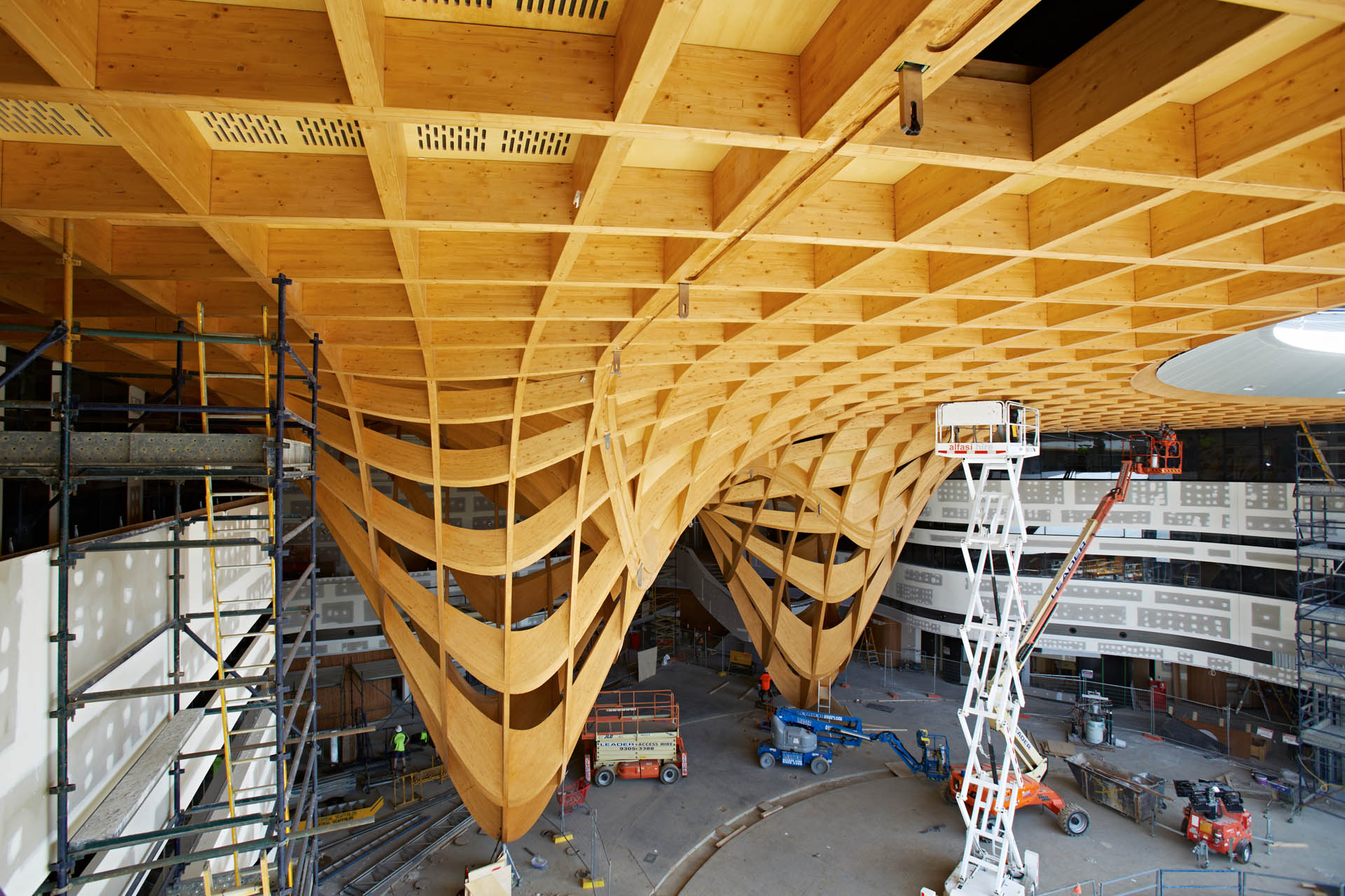 The building's dominant feature is a timber gridshell, the first of its kind in Australia, that defines the main atrium. This impressive central area incorporates a 12m high glass Façade facing a large community plaza area beyond.