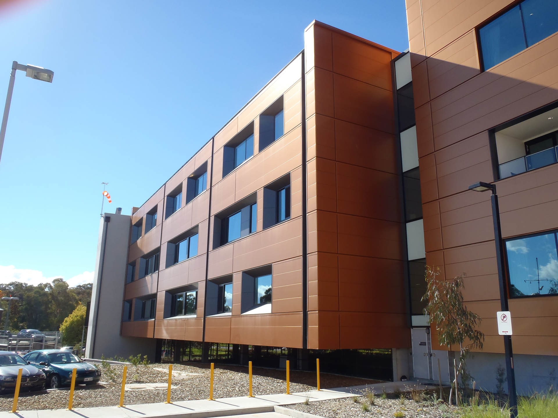 The new 4 storey building uses a balanced cantilevered band beam structural system to minimise building columns and foundations. Surrounding existing buildings were strengthened with carbon fibre strips on slab soffits, and additional shotcrete in core walls.