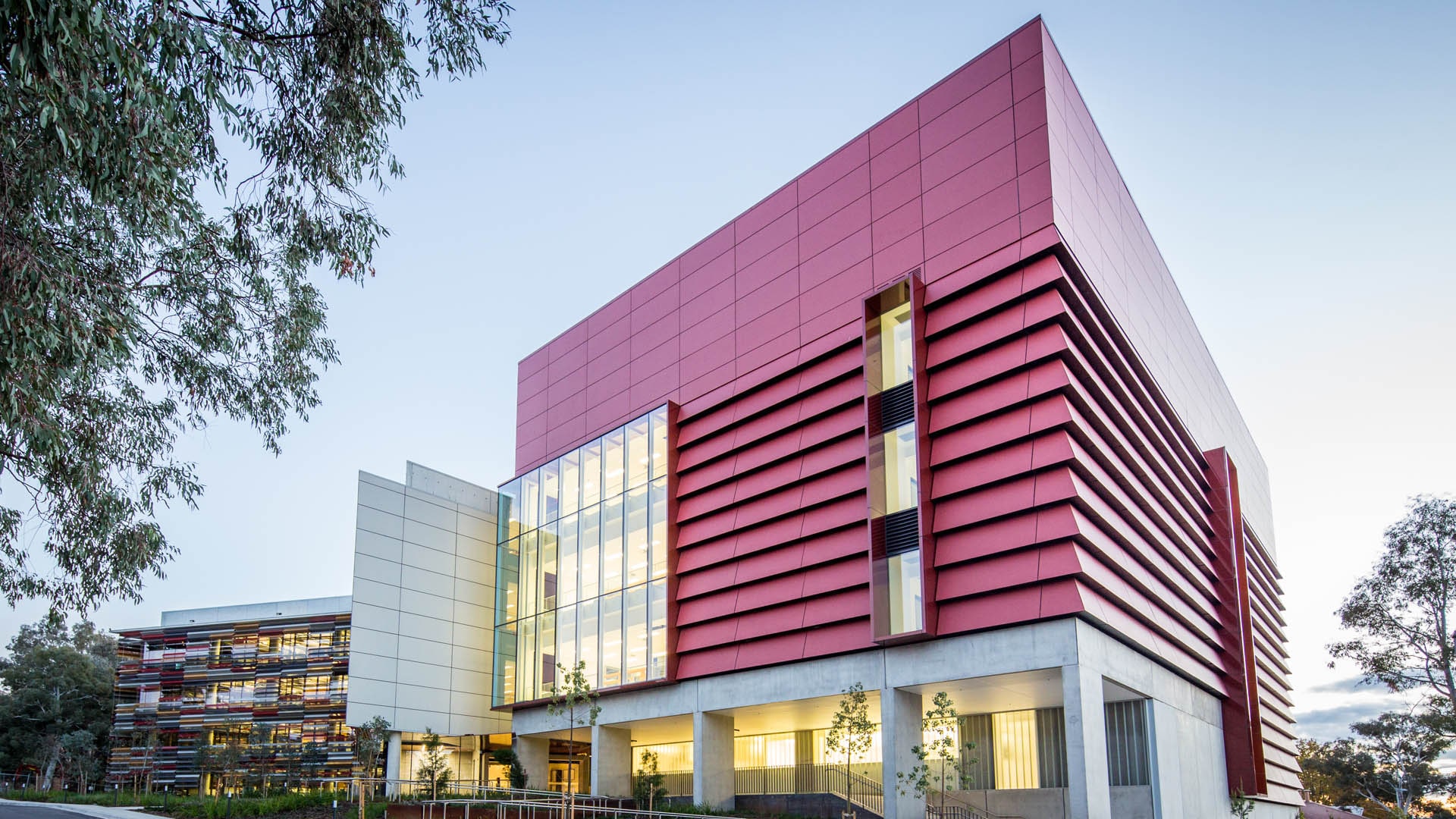 This facility is part of the ACT Site Consolidation for CSIRO, being located at the Black Mountain Science& Innovation Park. The project delivers 15,000 sqm of world-class research and support facilities with purpose-built laboratories.The new structure is essentially two buildings in one, with a carefully hidden junction.The modern office space links to the laboratory building through steel and glass bridges at each of the four levels.