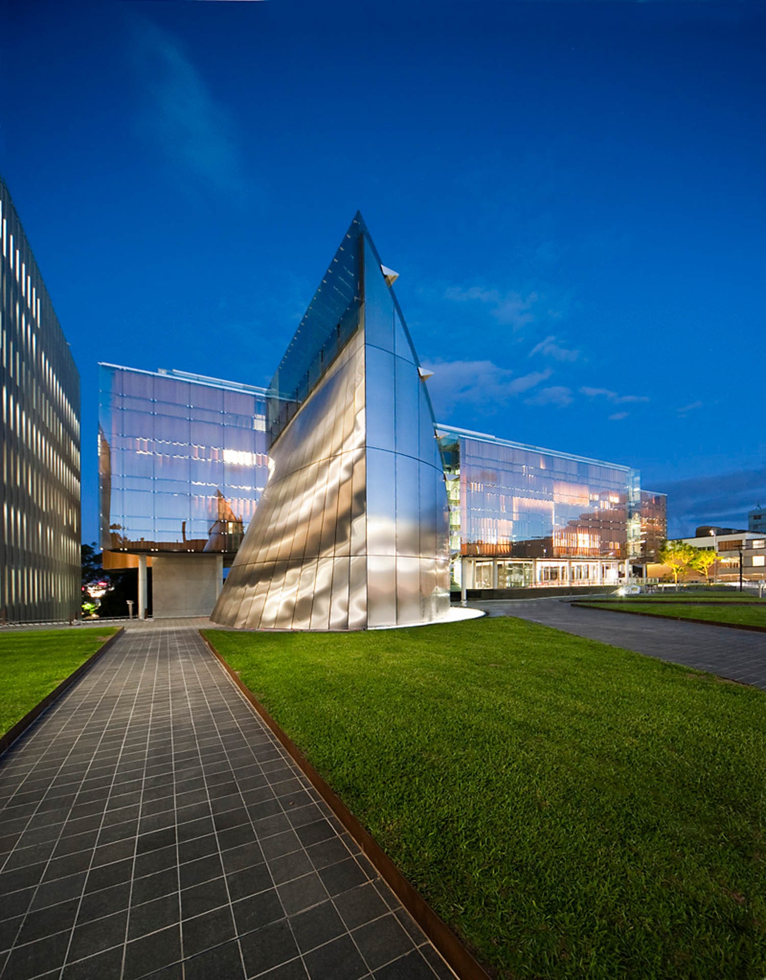 The Faculty of Law's new school building represents the transformation of a key site to a powerful gateway to the campus of The University of Sydney. The design encompasses modernism, providing a functional learning facility complete with lecture theatres, library, retail, basement car park and integrated public domain.The double-skin ventilated Façade with occupant controlled timber louvers, precinct storm water collection and a light tower all meet the key client requirements of sustainable innovation. There is an abundance of natural light giving the ambience of tranquillity and elegance to inspire the academic staff, administrators and students.