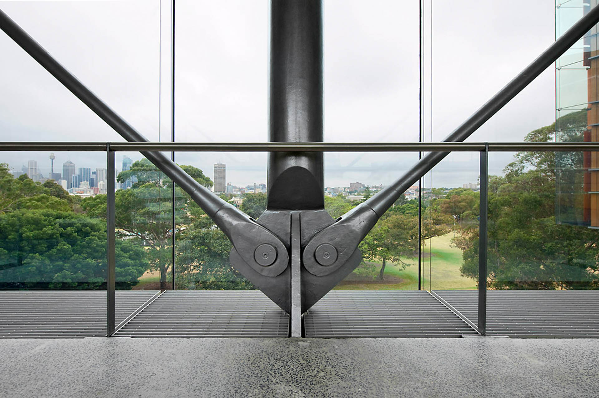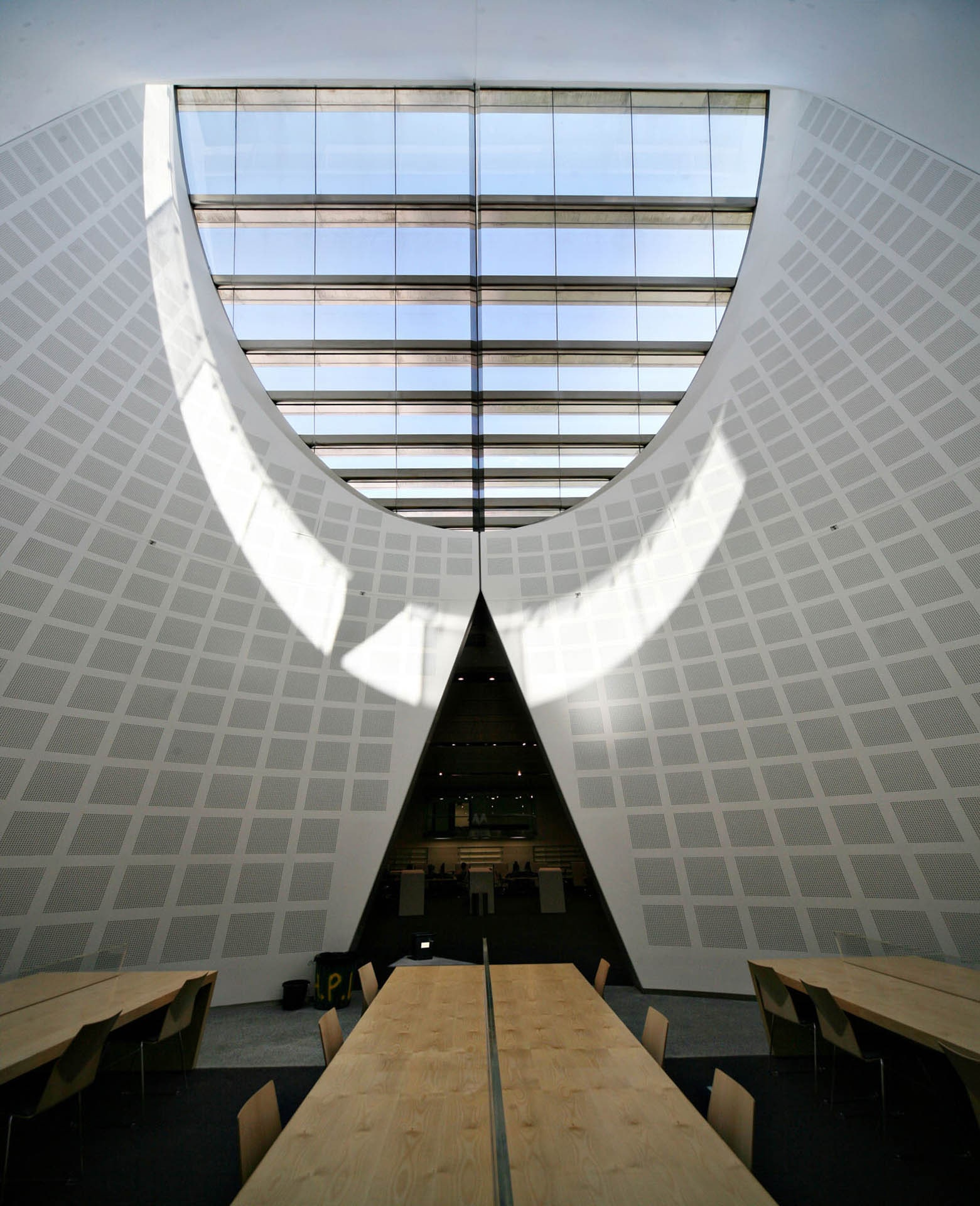The interesting structural features of the building are the new bridge across the street to the park and the major skylight over the entrance.