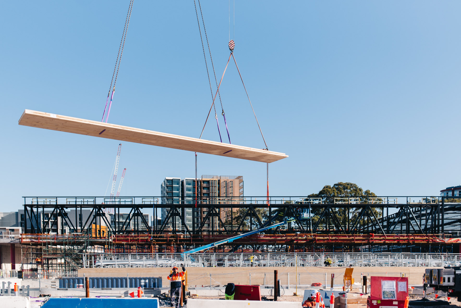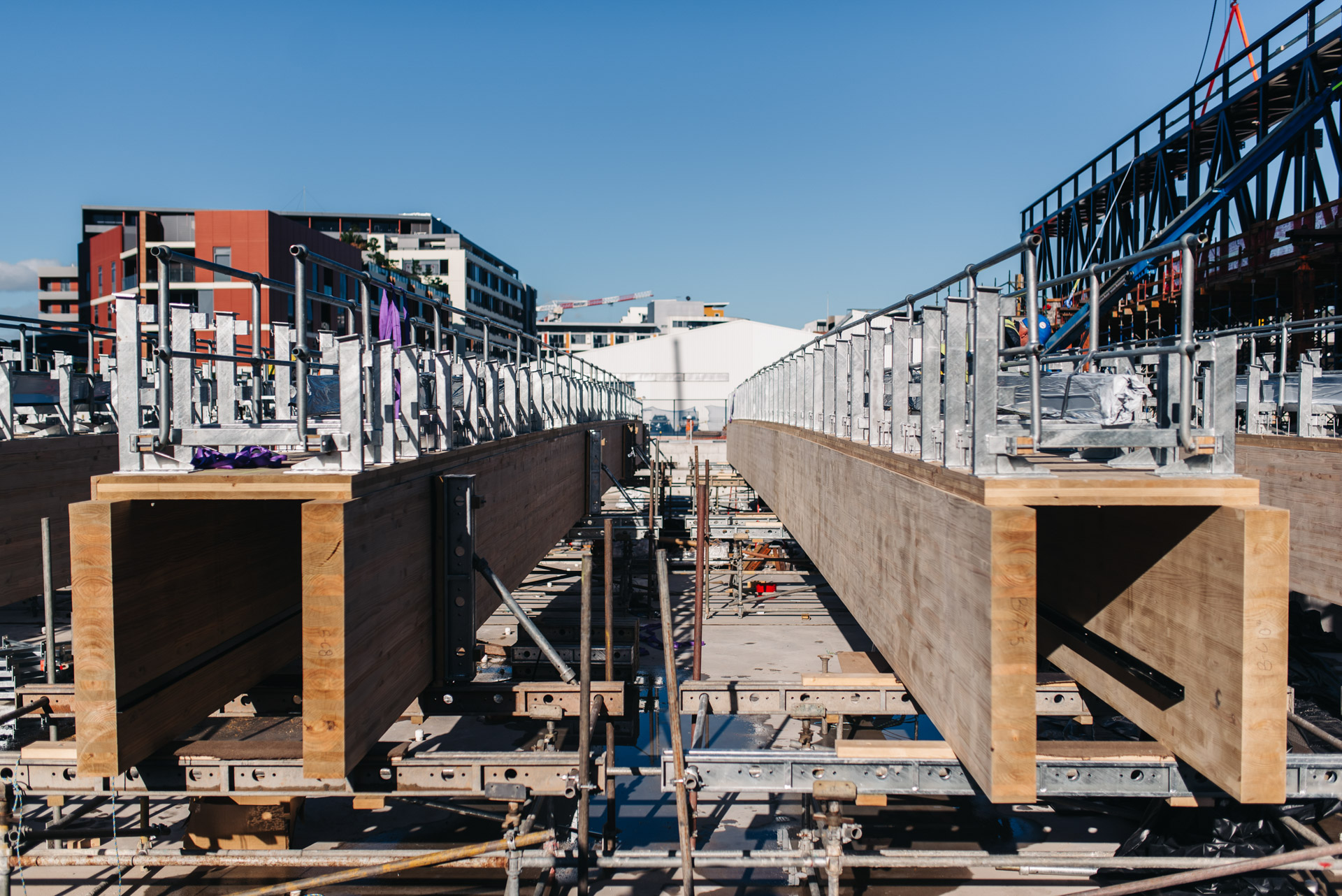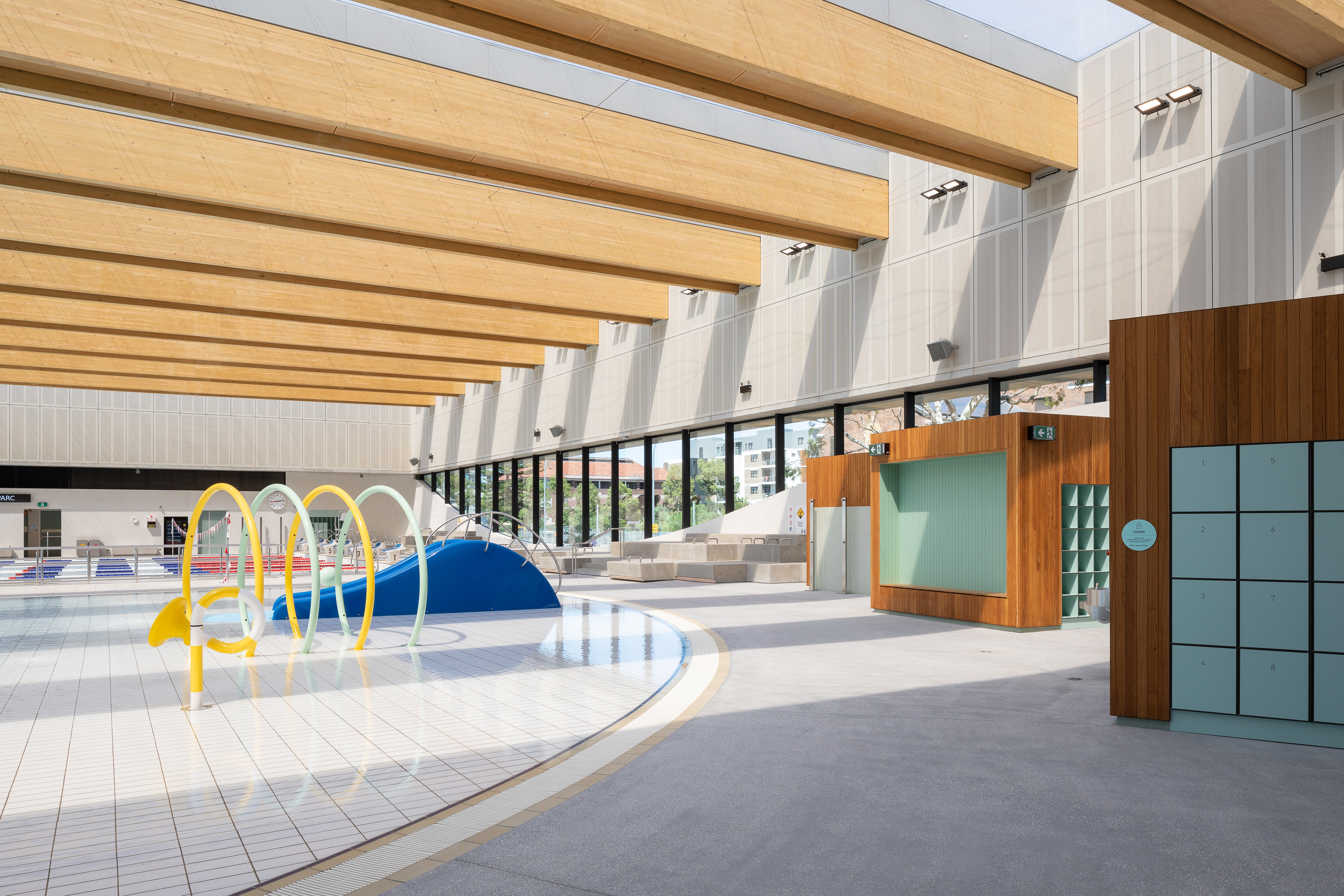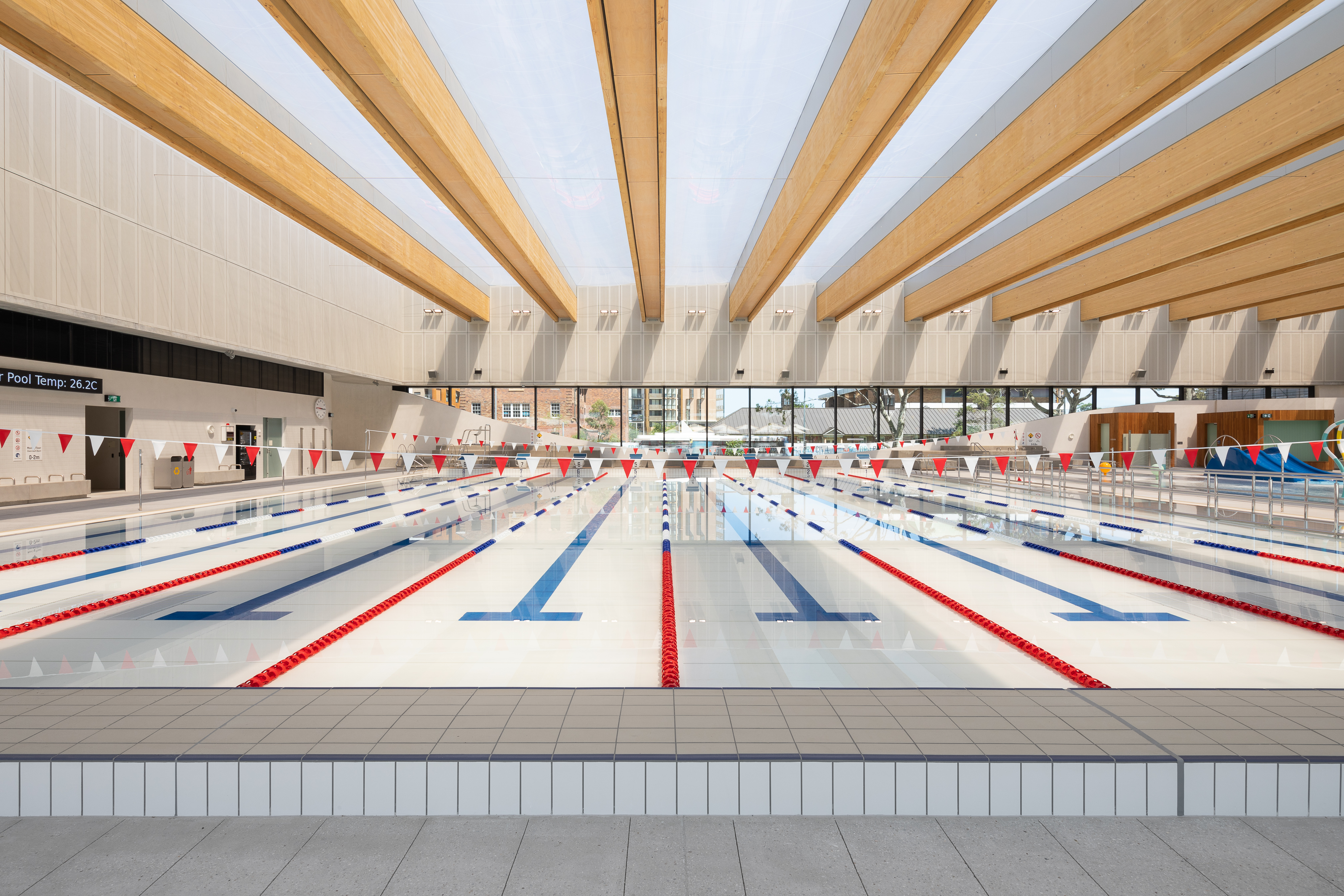Unique to the project are 50m long steel trusses either side of the pool hall which support 36m long glulam mass timber beams. These beams are the longest free-spanning mass timber beams in Australia. Pressurised ETFE 'pillows' form a translucent roofing membrane between glulam beams. Below the 50m steel truss hangs an architecturally exposed concrete slab and external green roofs are supported on curvilinear concrete slabs.
