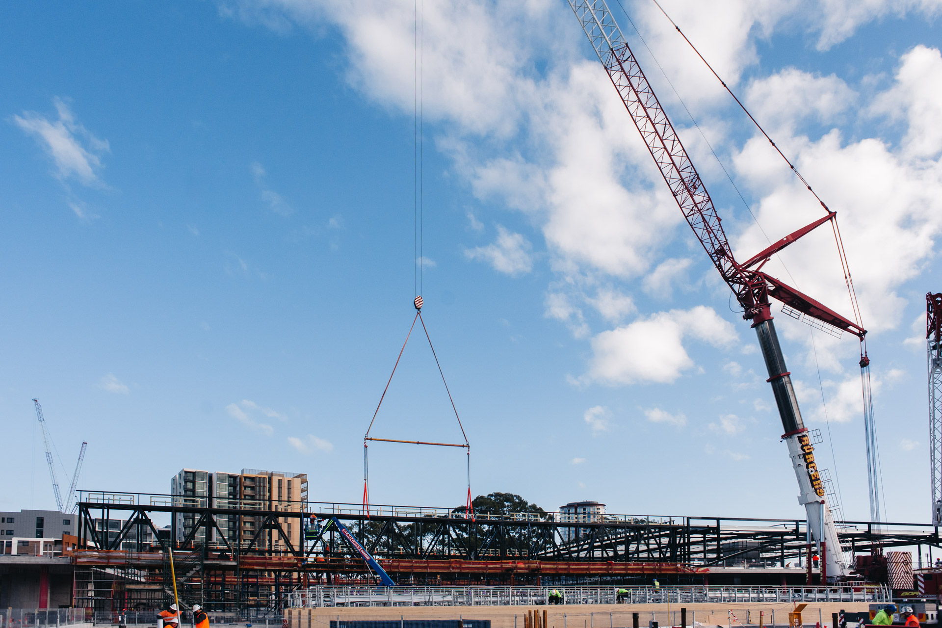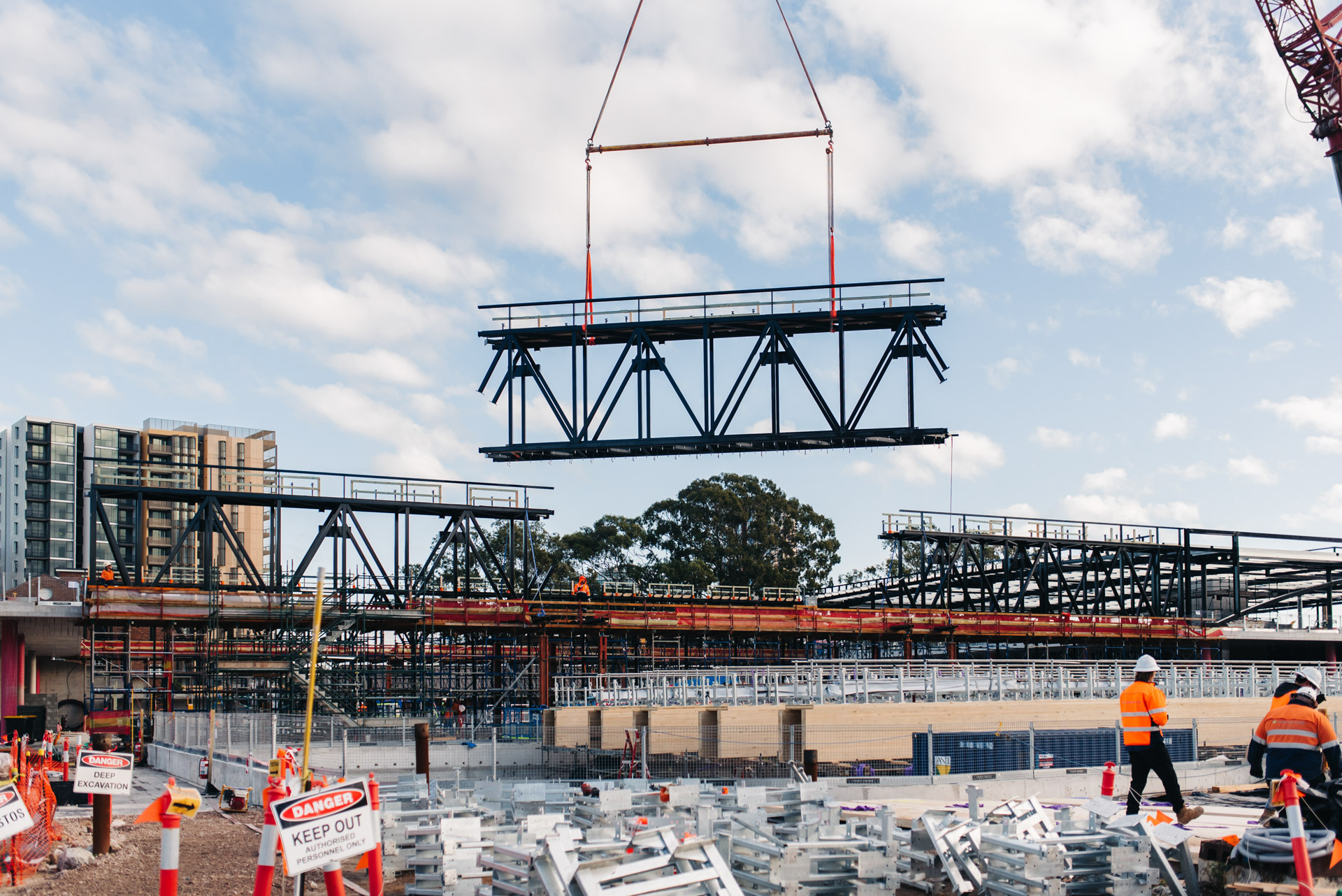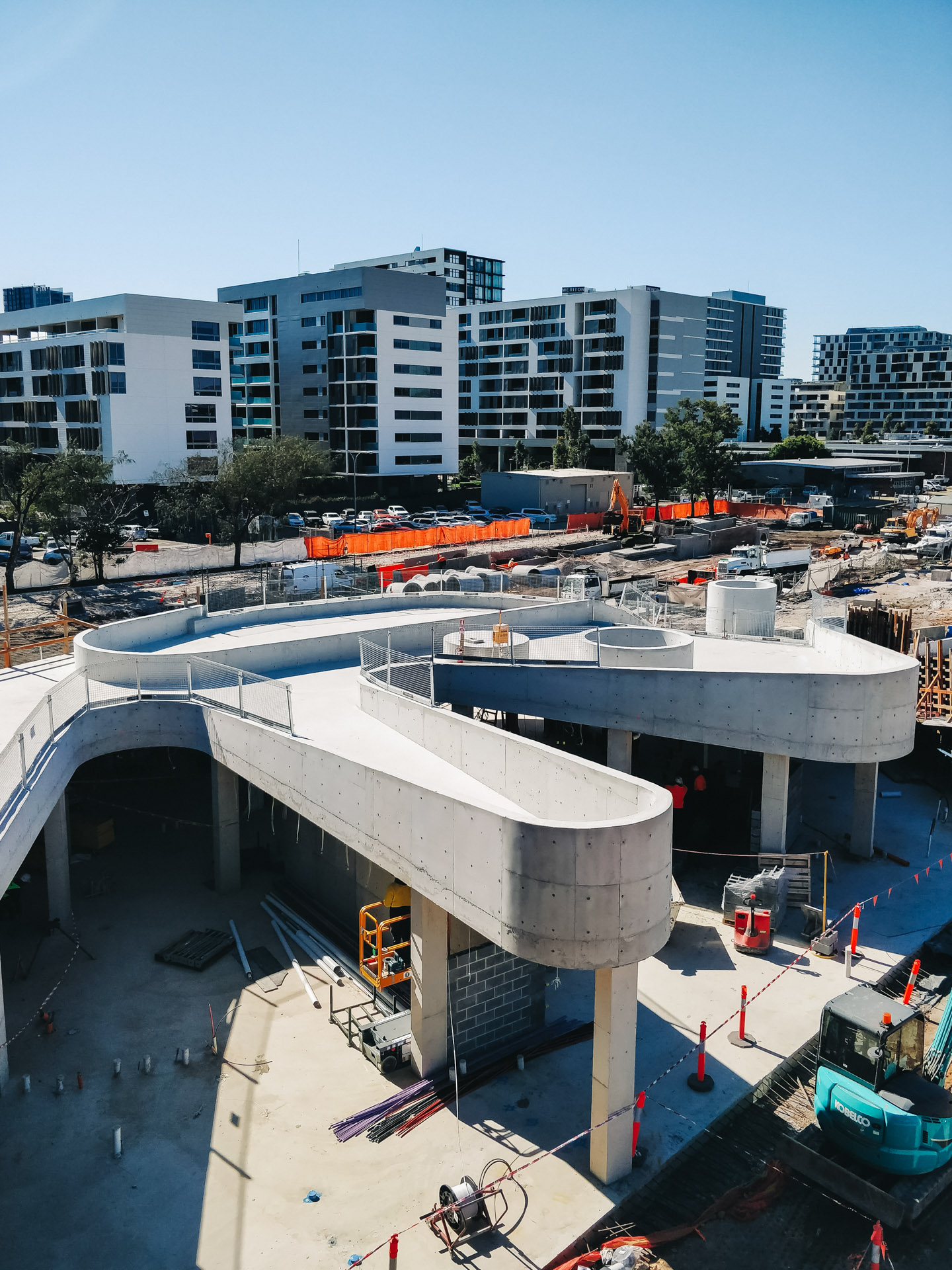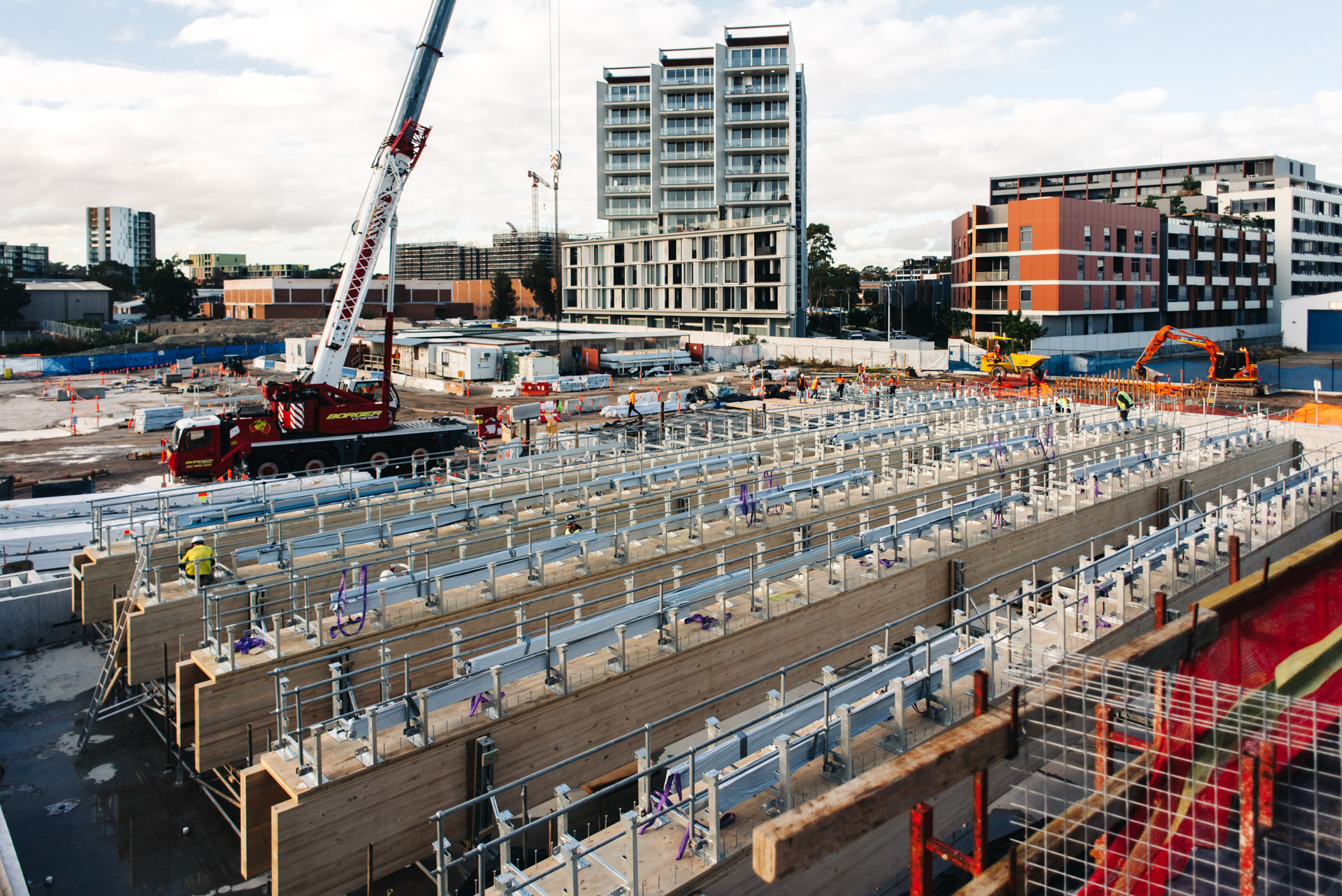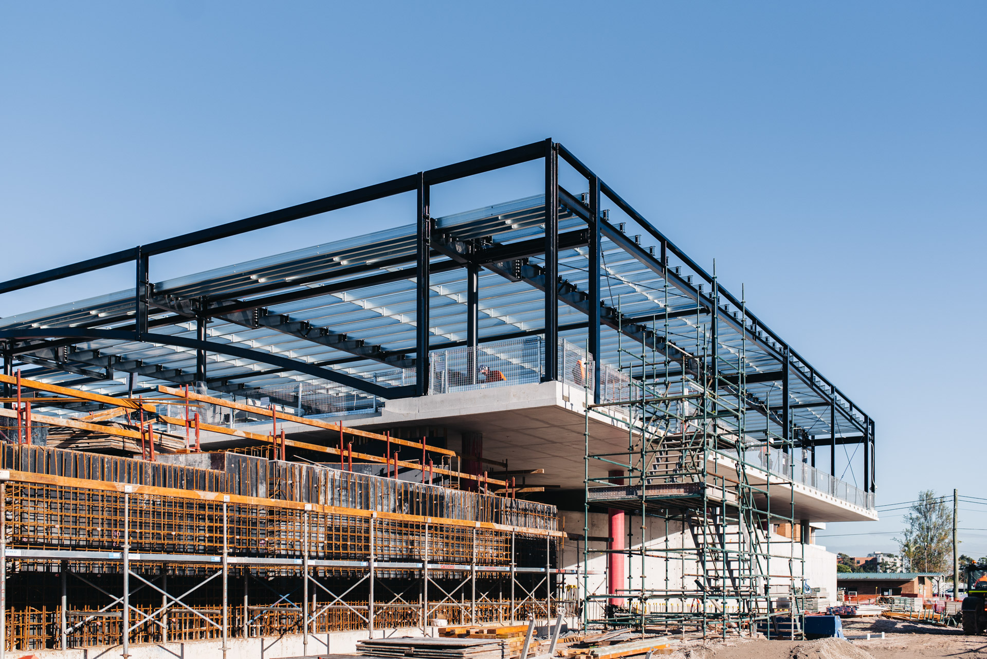 Unique to the project are 50m long steel trusses either side of the pool hall which support 36m long glulam mass timber beams. These beams are the longest free-spanning mass timber beams in Australia. Pressurised ETFE 'pillows' form a translucent roofing membrane between glulam beams. Below the 50m steel truss hangs an architecturally exposed concrete slab and external green roofs are supported on curvilinear concrete slabs.