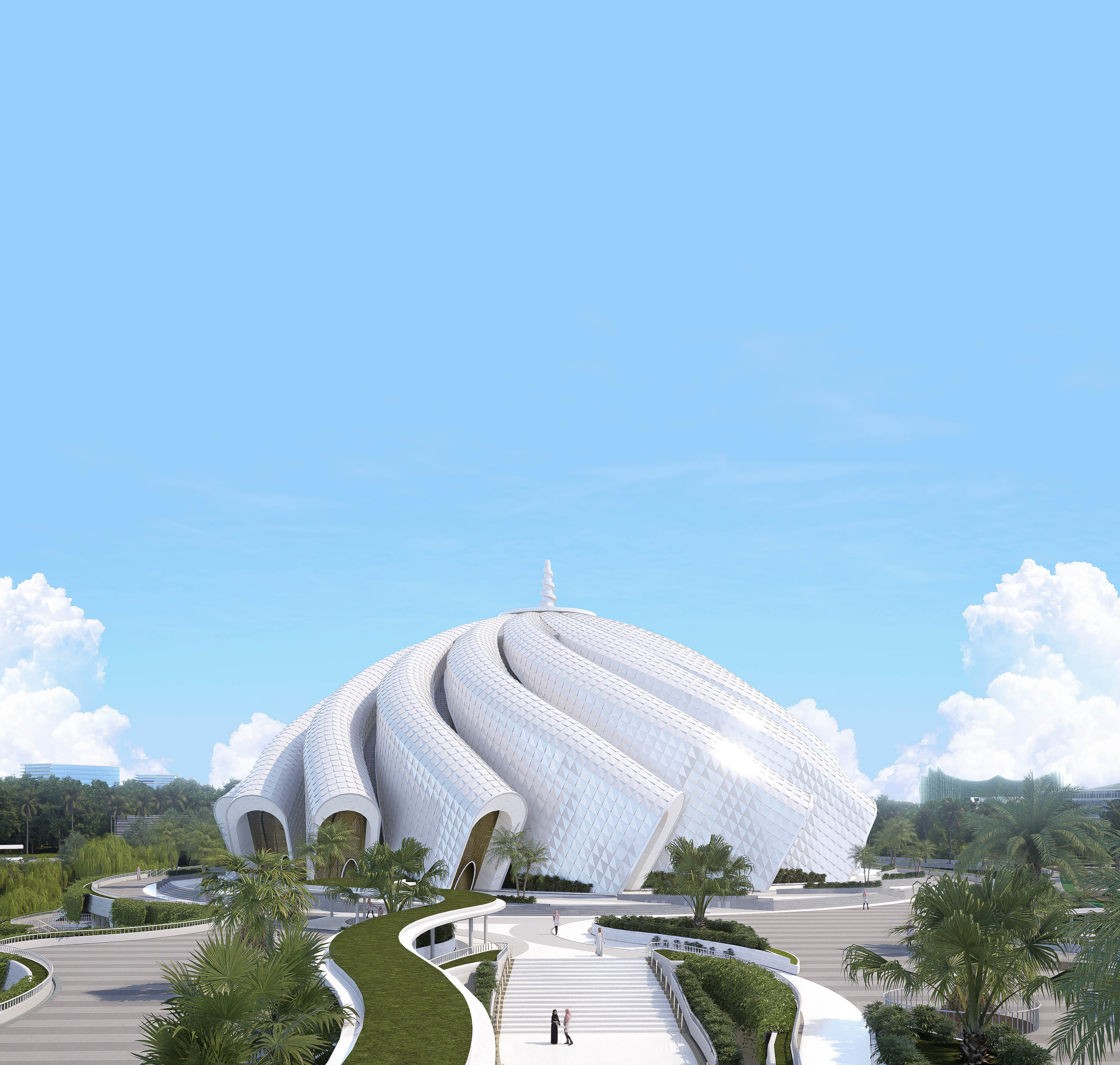 Features of the mosque include a 70-meter diameter twisted dome and a 99-meter high, steel-frame system minaret.