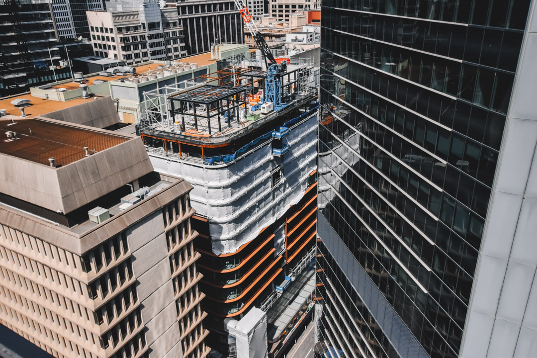 • A tower crane has been fixed to the roof of the existing structure to enable the site to operate with minimal impact on Clarence Street and the train station entry below.