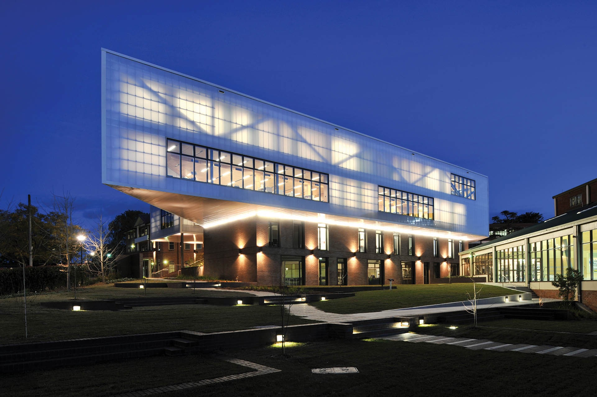 The modern design of this 4-storey building fits within a campus of mixed structures and required close collaboration between architect, engineer, and contractor to execute a finished result that has become award-winning.