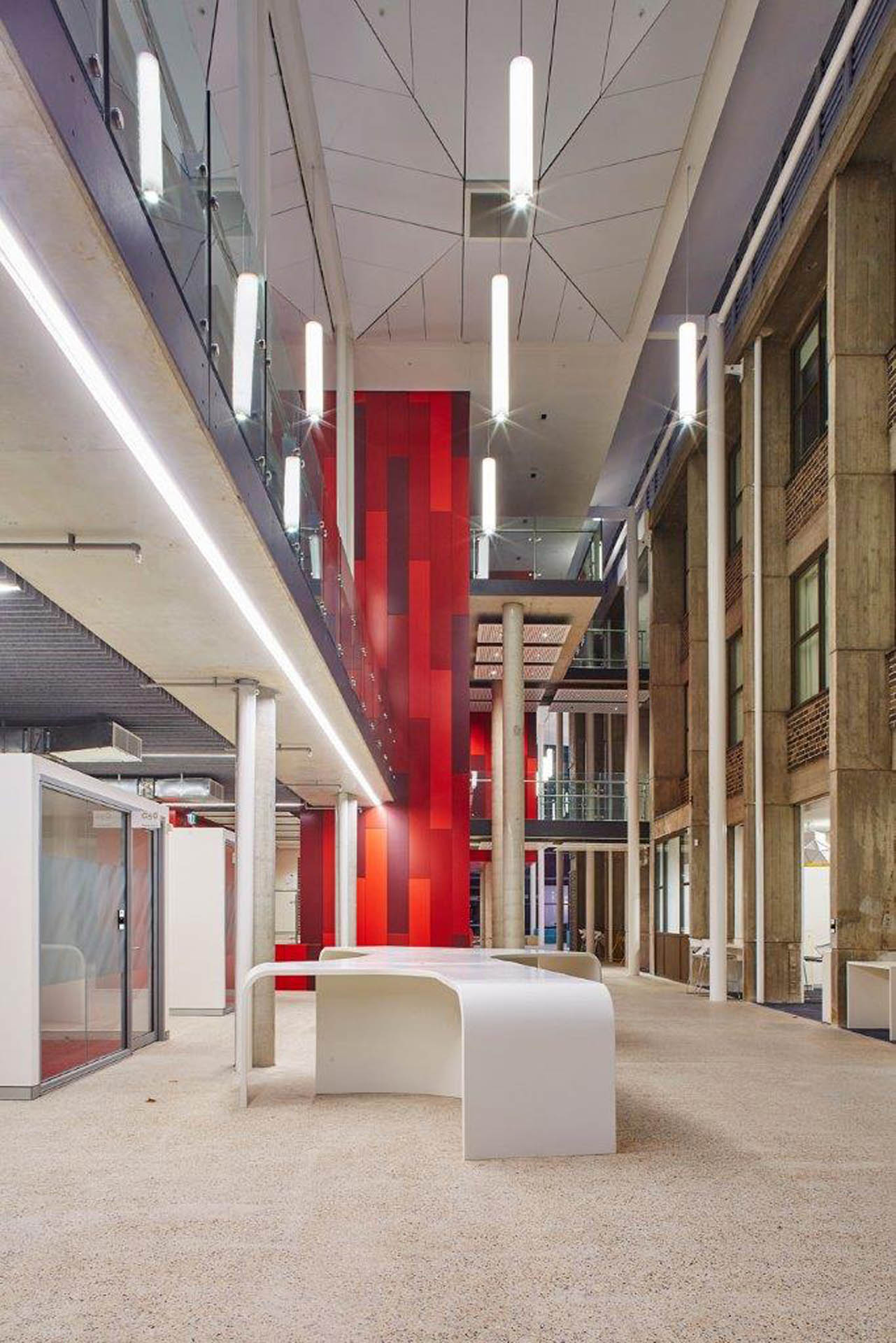 A glass atrium extension was also created between E7A and E7B to link the buildings and provide a sophisticated new space that now houses a café and meeting areas. Sustainability is also a feature of the building's design; including the adaptive re-use of existing structures, and the utilisation of high-performance Low-E glazing.