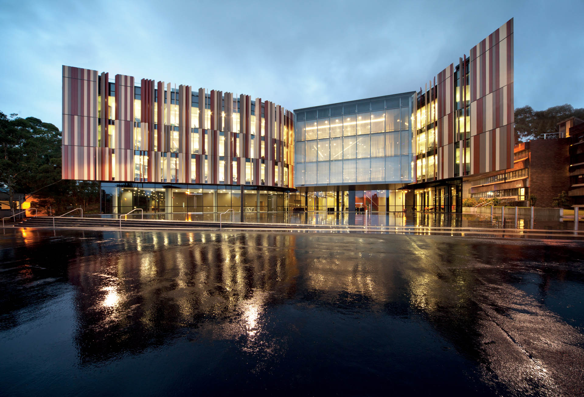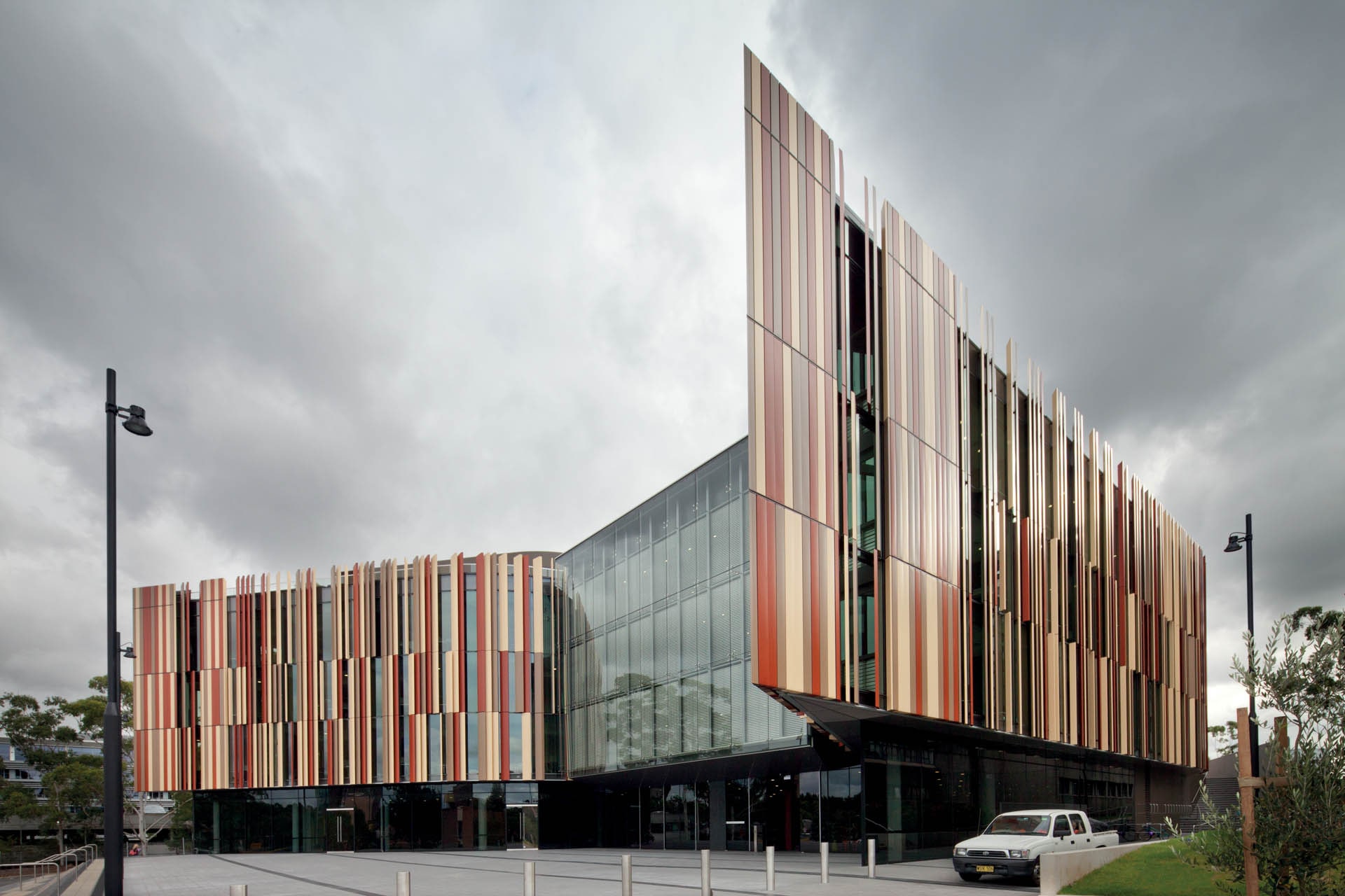 Inspired by the natural landscape and parklands of the university, the new library was designed to create a transparent and inviting space with a focus on sustainability. The complex Façade of the building was constructed from a mix of aluminium framed performance glazed curtain wall panels, multi-coloured aluminium Façade panelling and sun shading fins.