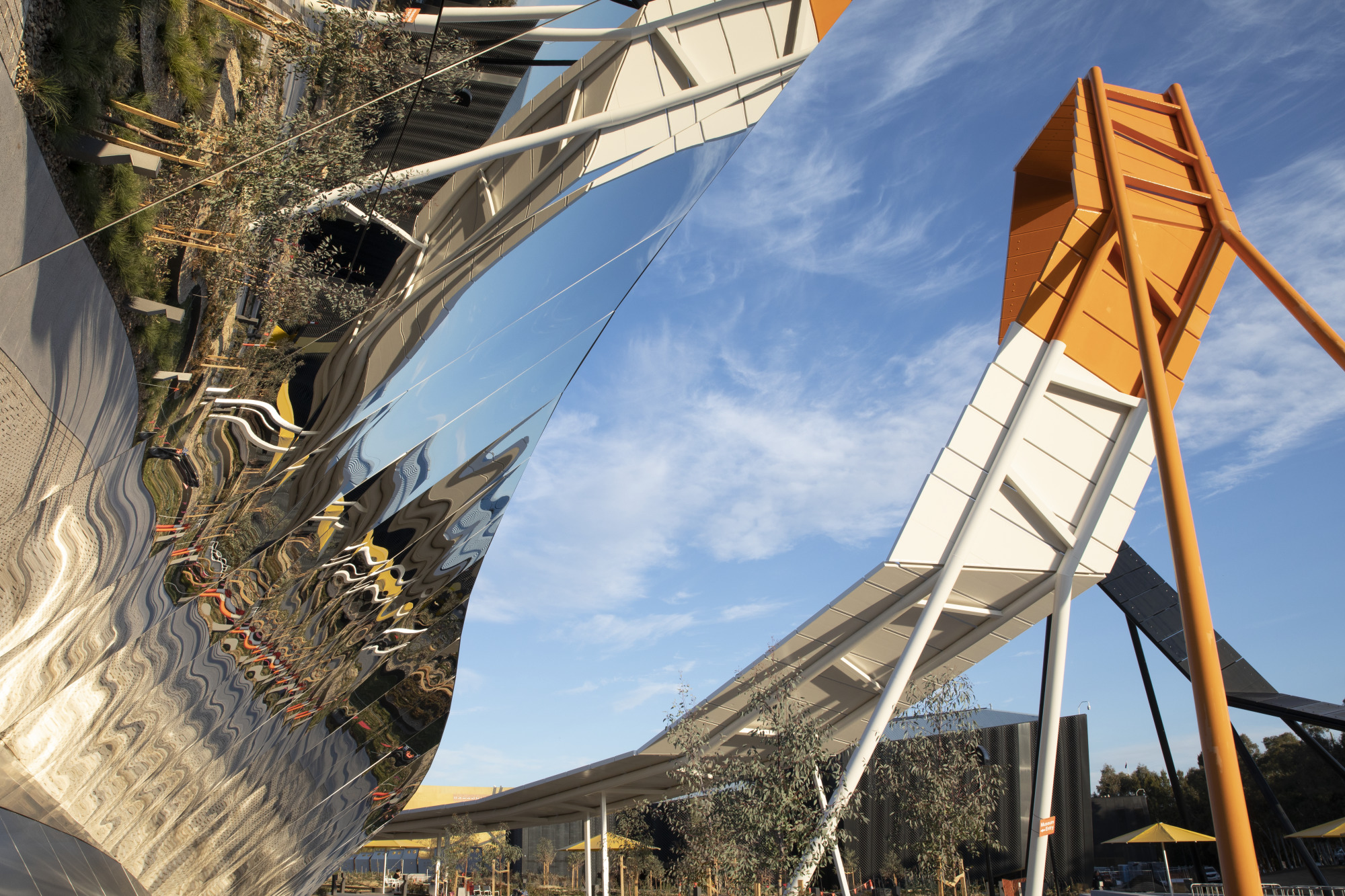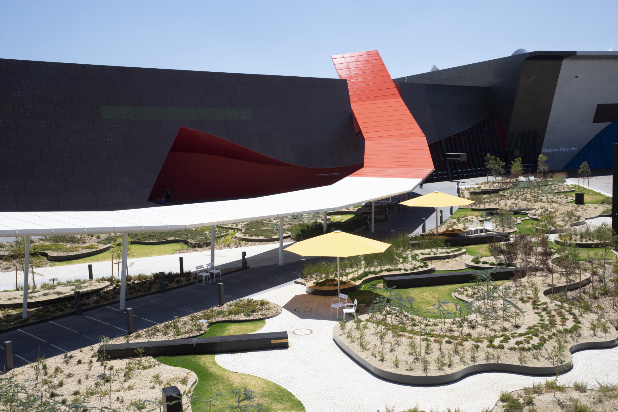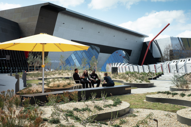The upgrade of the Welcome Sequence, the Forecourt, and the front public entry defines a clear journey and arrival experience to the museum. This creation of a clear sense of Welcome forms an integral aspect of the museum experience and visit to the Acton Peninsula, allowing the visitors to engage with the site. The new works provide a diversity of experience, while increasing public realm amenity, accessibility, security, and an improved micro-climate in the Forecourt.The development showcases many unique features such as the Welcome Wall which is a large, multi planer structure, designed to appear as a continuous curve. The front face of the wall is clad with mirrored panels, imported from Italy, which are a prominent and striking feature to visitors, while gro-wall panels are mounted on the rear face to soften the wall into the landscape.