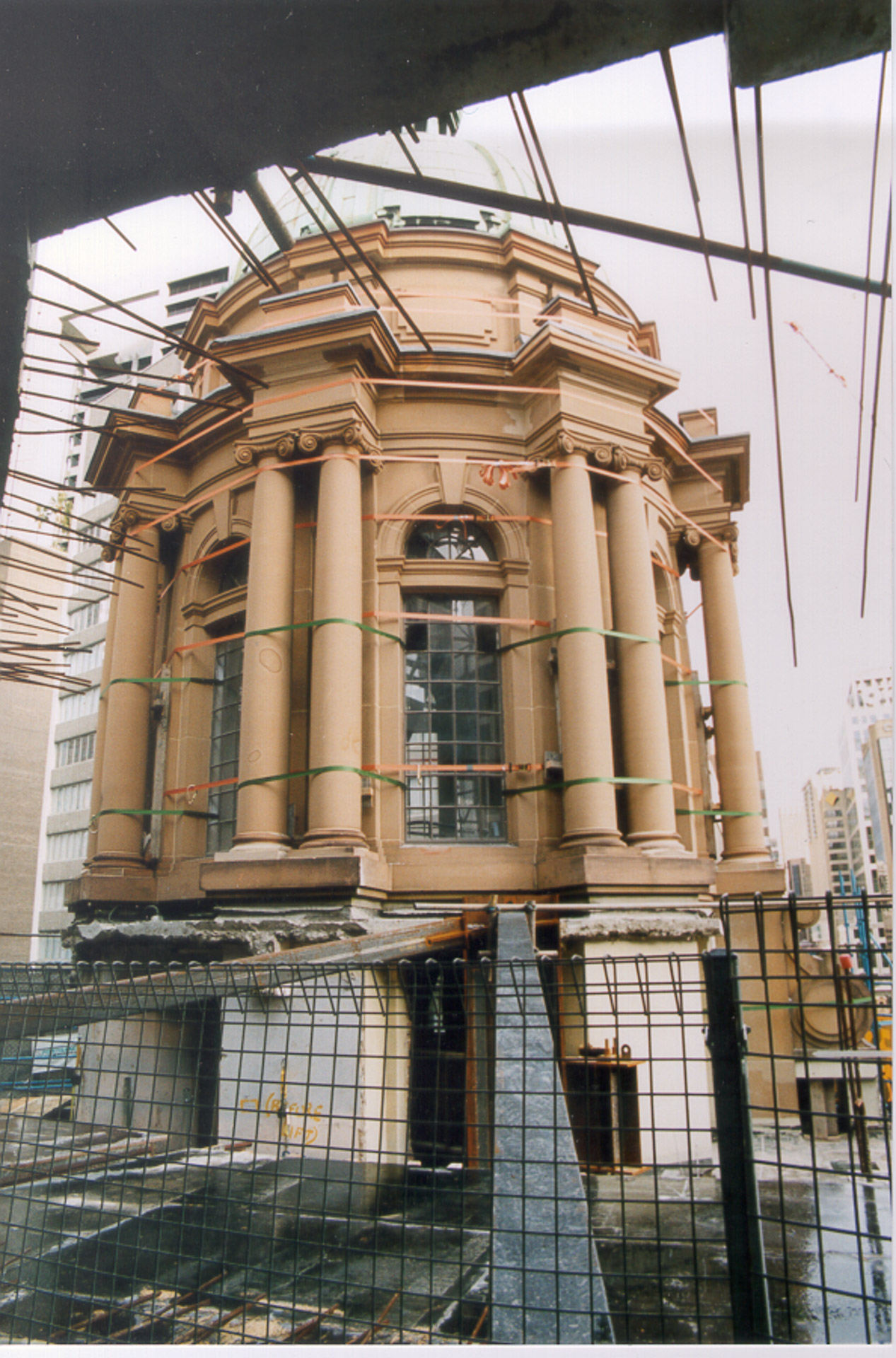 This Fairfax Printing Building was converted into a 363 room hotel. Three additional levels were added to the top of the existing structure necessitating column strengthening and stiffening for additional lateral loads. The 100 tonne stone cupola was raised as one piece to its final location.