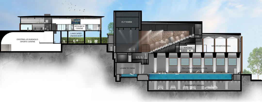 St Catherine's School RPAC Stage 1 involves the construction of a new multi-storey building housing basement car park, aquatics centre and performing arts auditorium above. The new construction has been designed to seamlessly merge with surrounding buildings to become an integral part of the school campus.