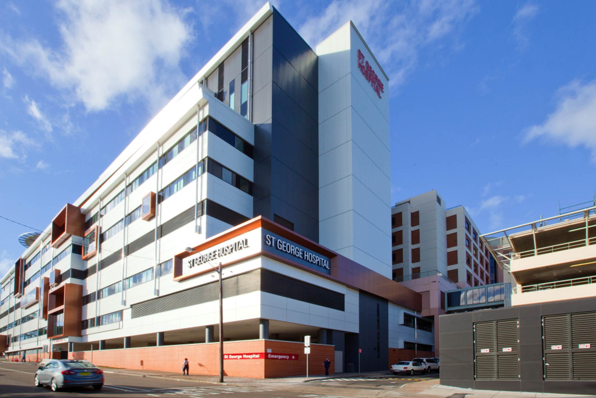 The centrepiece of the major redevelopment for St George Hospital is the 8-storey Acute Services Building. Constructed over an existing building, the Façade required lightweight metal-frame walls without the need for heavy structural steel members.The building's Façade consists of insulated metal panels in front of a metal sheet air barrier (producing an airtight result rather than usual sarking), glazed aluminium windows and curtain walls. TTW's Façade engineers designed stud walls to form a strong back panel solution, hanging from the edge of the concrete, and collaborated with contractors to adopt common materials (metal sheets and studs) in a new and different application.