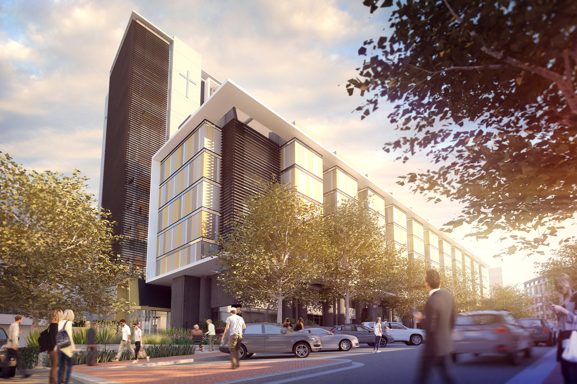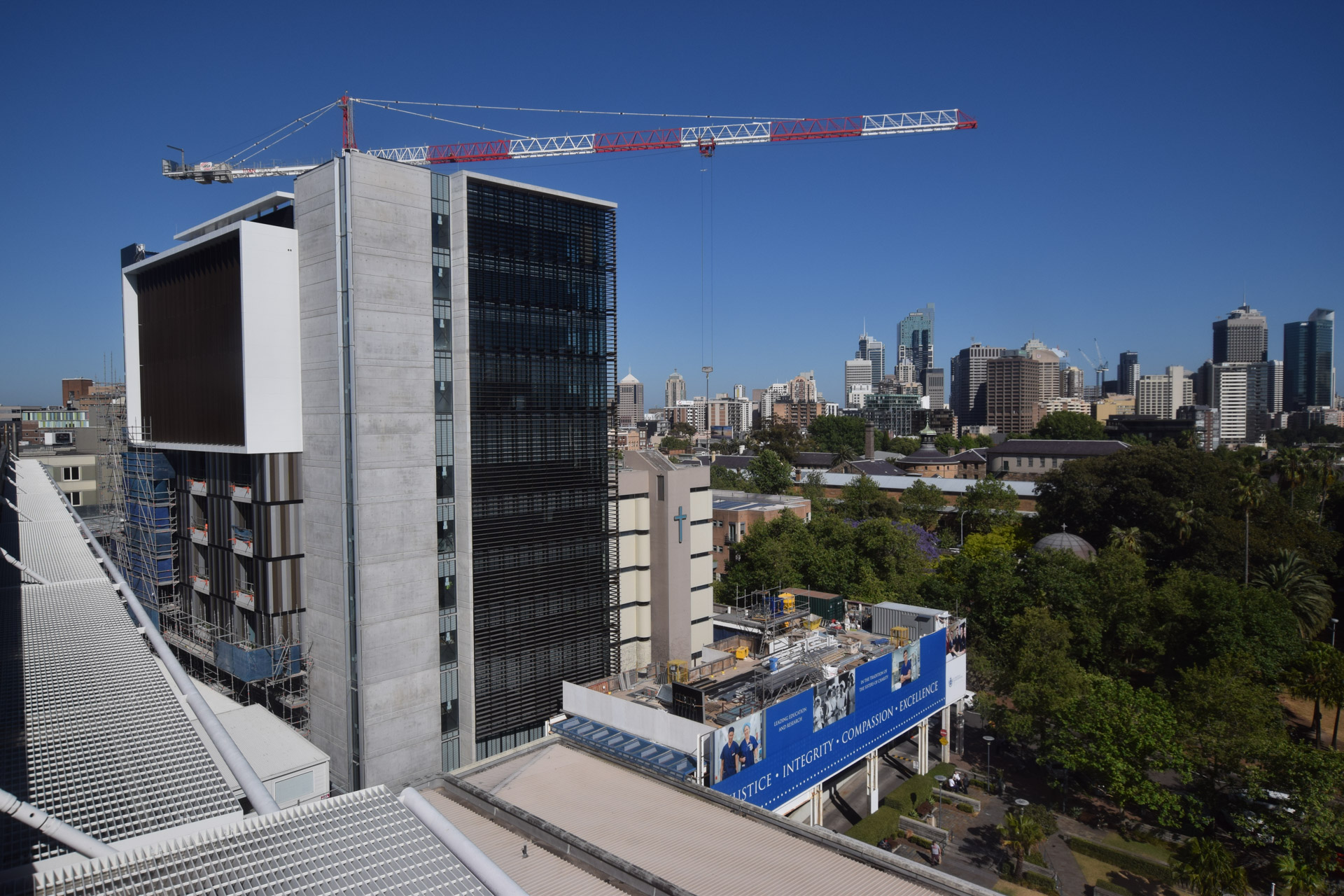 The redevelopment project for St Vincent's Private Hospital Sydney involves construction within a live hospital environment bounded by buildings on all four sides of the site. The team is working within these constraints to deliver a new 15-storey Clinical building, vertical extension of the existing 1970's hospital for a new CSSD and full refurbishment of the existing hospital. The clinical building will incorporate expanded inpatient units, two new operating theatres, new ambulatory care services, new rehabilitation service with hydrotherapy pool, redeveloped staff cafeteria, and additional doctors' suites.Addressing the site congestion required construction over operational buildings with column transfers allowing the airspace of the existing buildings to be utilised. This high-quality project uses smart engineering solutions to maximise hospital floor area, including cantilevered modular fire stairs, new steel lift shafts through the existing operational hospital, and modular steel bathroom pods suspended off the side of the existing building.