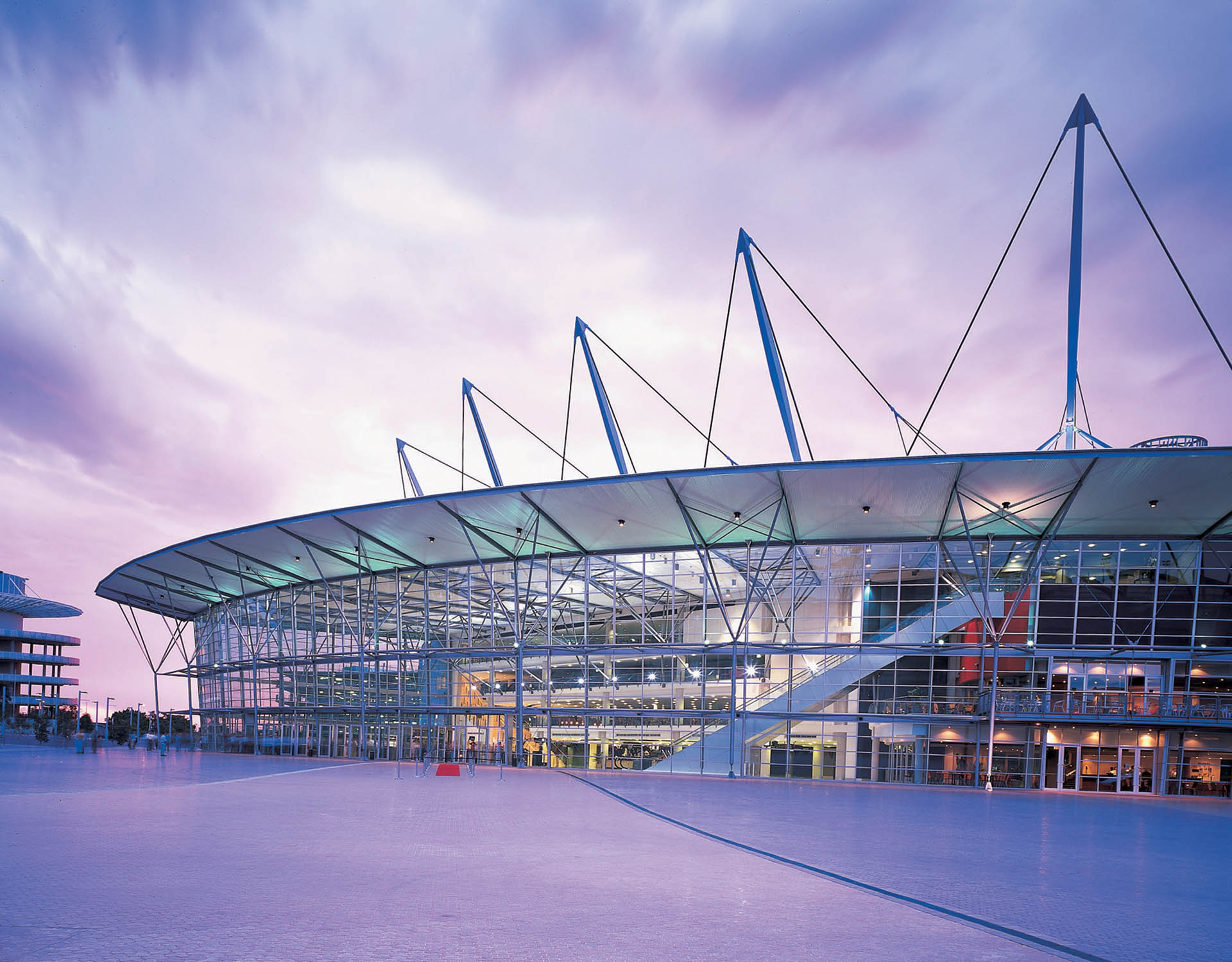 The Sydney Super Dome (currently known as Qudos Bank Arena) is a large multi-purpose arena designed and constructed for the 2000 Summer Olympic Games. The stadium was designed with the intent of being a world class facility to house some of Australia's great, memorable events. The structure is a single roofed enclosed erection with an innovative flexible expanse of steel and glass. The roof masts reach 42m above ground and in total the stadium occupies a site of 20,000m2.Ranked in the top 10 arenas worldwide, with a total capacity of 21,000 the Super Dome is the largest permanent indoor sports venue in Australia.