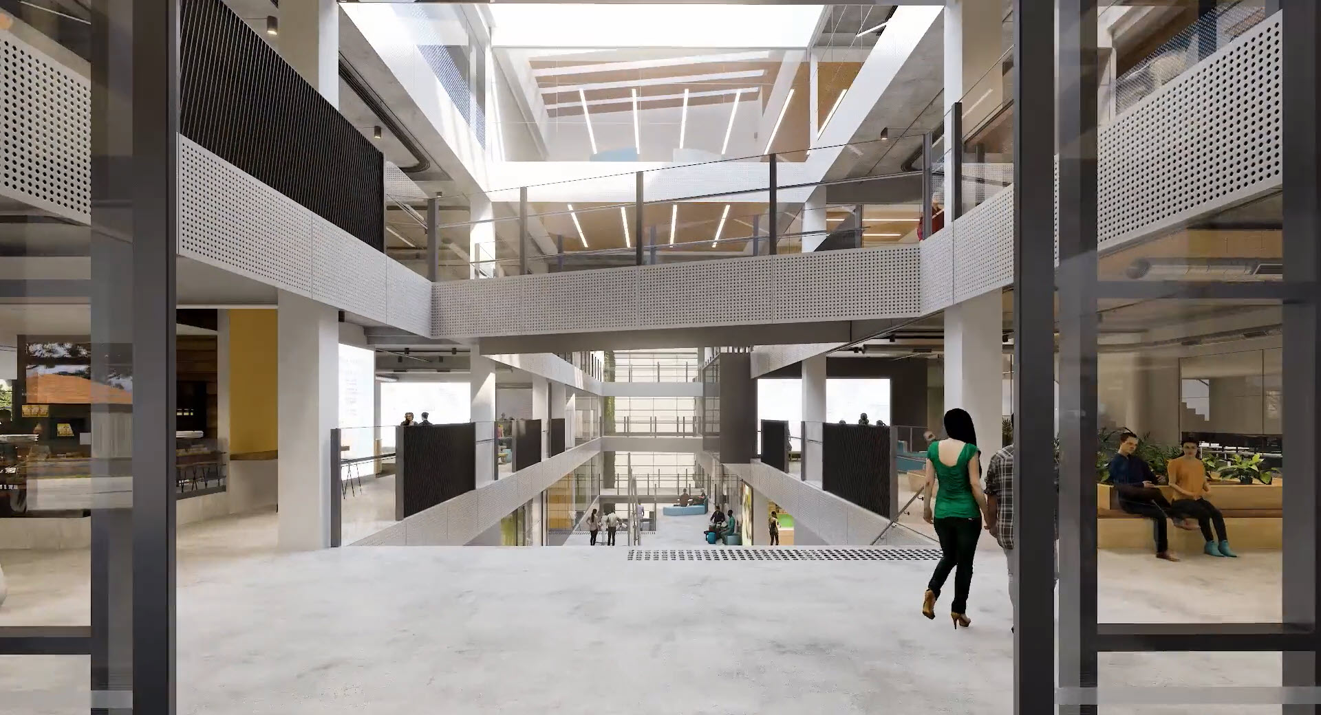 As part of the upgrades to campus access, TTW also designed a large atrium through the centre of the building which serves to connect See Street to the East and the main campus to the West. High-level interconnecting pedestrian bridges further aid connectivity by linking across the atrium.