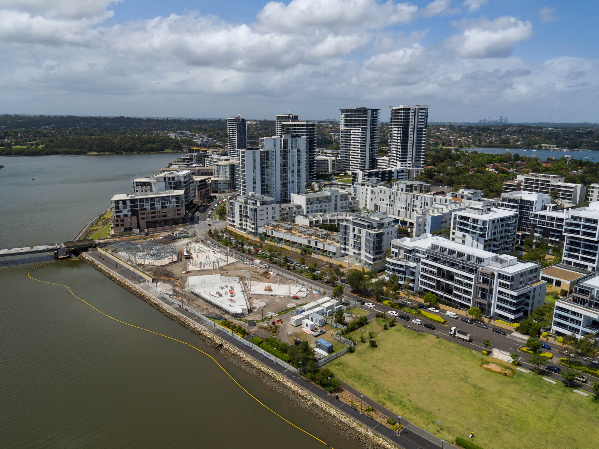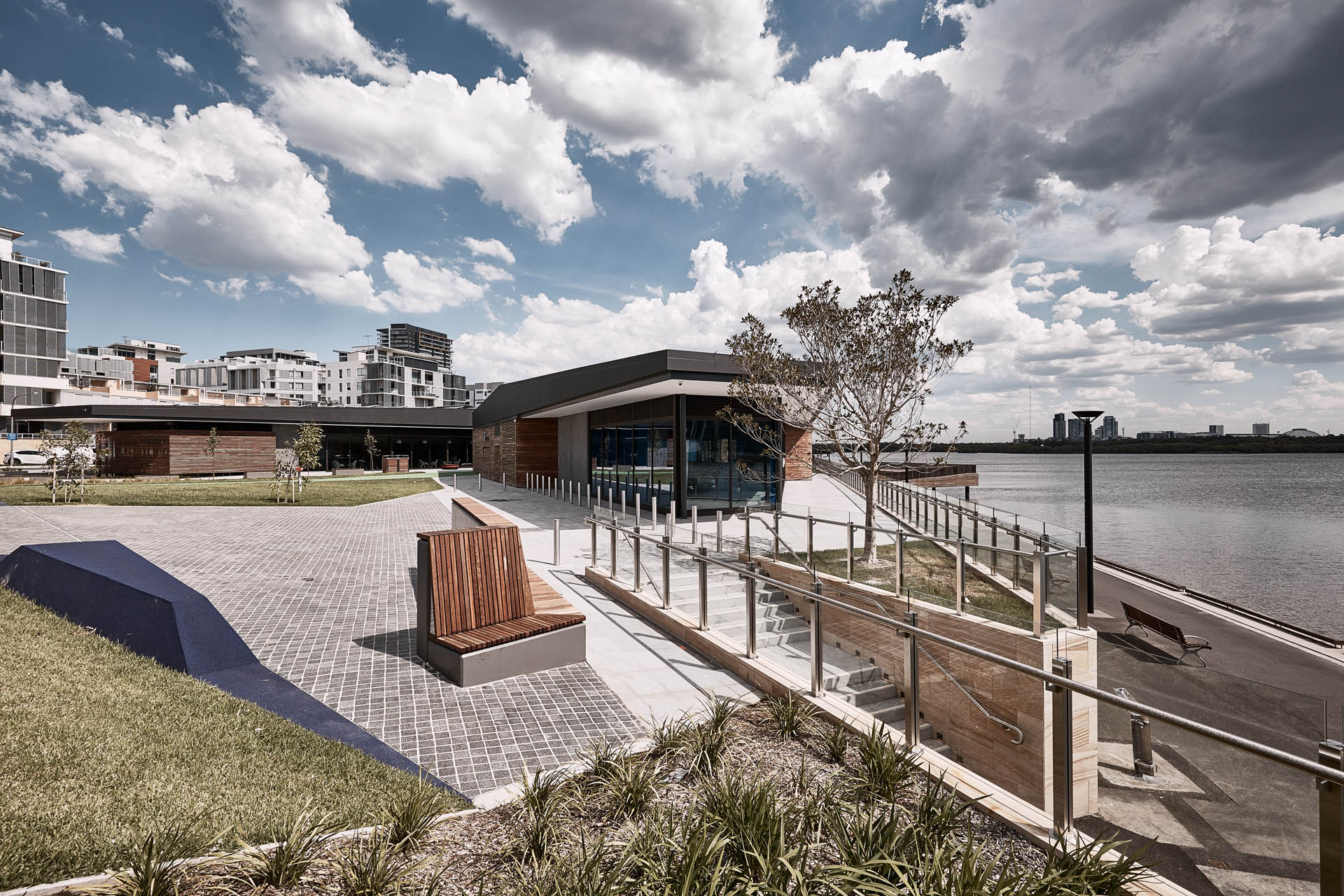 Functionality of design was a paramount consideration for this new community precinct in suburban Rhodes. The choice of structural steel as the basis for construction allowed for the optimum solution to address various site constraints; providing a method of building that was quick, simple and avoided excessive interruptions to the surrounding traffic and community.Addressing the requirement for multiple public entry points (including water frontage and two street entrances) the site consists of four interconnected buildings in a series of complicated geometries. The single storey structures fit within the landscape of existing high rise buildings, avoiding blocking any water views, and providing a transitional space between residential areas and waterfront. The complex also showcases interesting textures and types of Façade cladding, including timber screens, glazing, precast panels and planting zones.