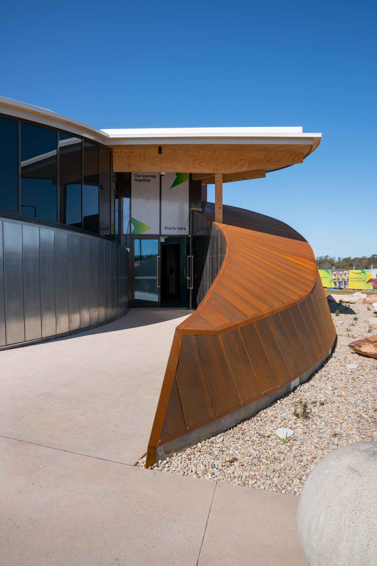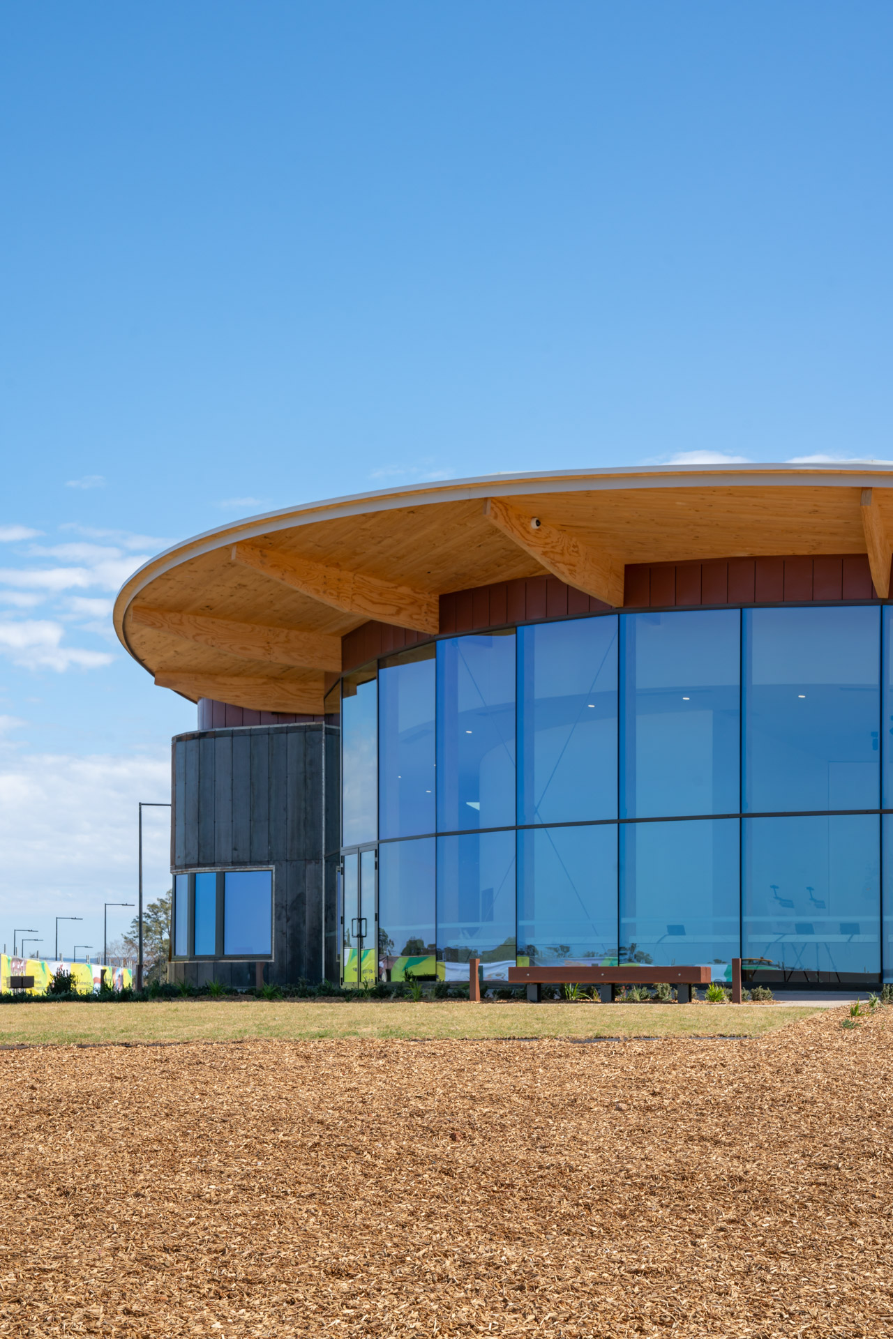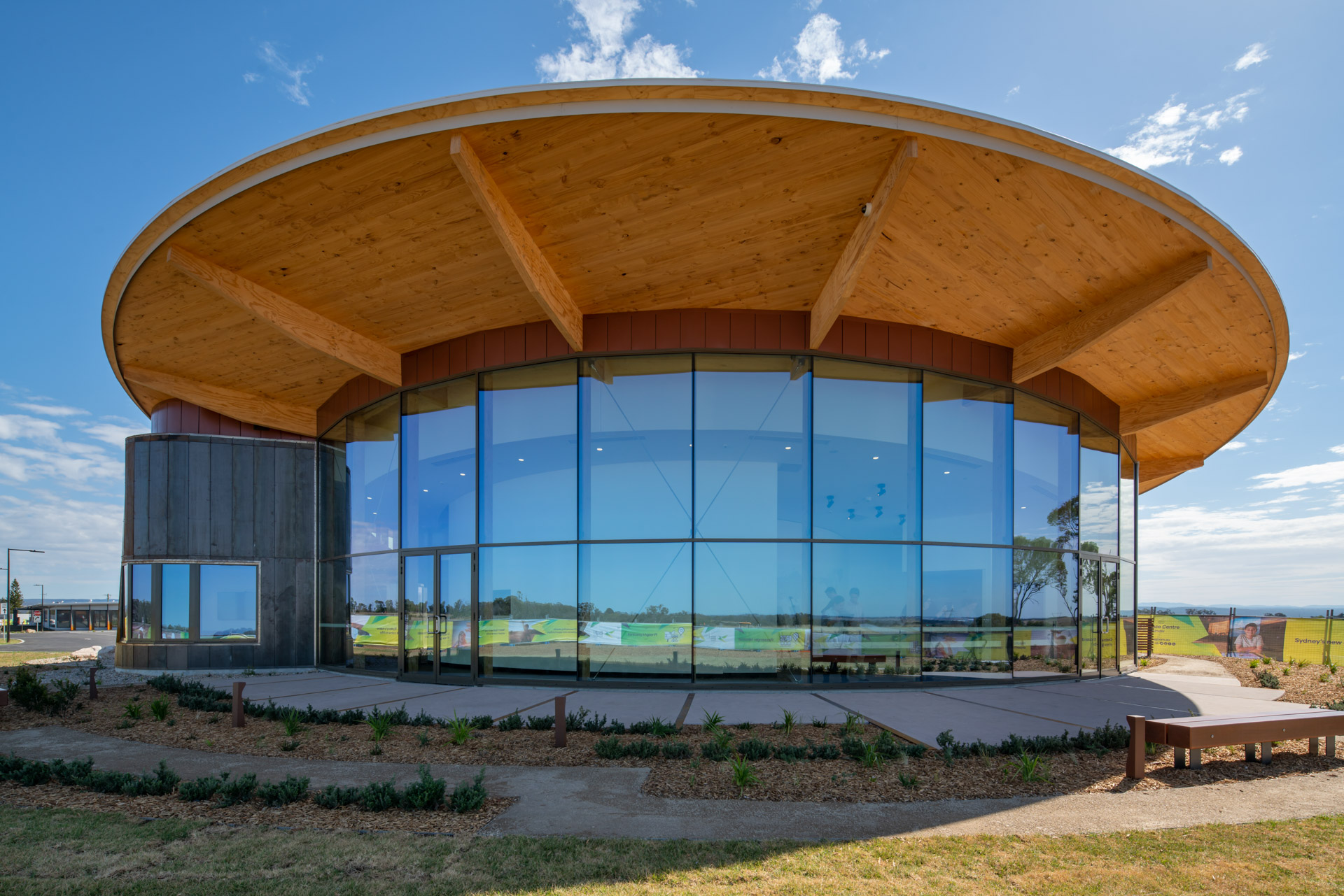 The Western Sydney Airport Experience Centre is an exhibition space showcasing the construction activity of the Western Sydney Airport. The 400 sqm education space features an exhibition hall, meeting rooms and a small kitchen. The general public will learn about the region and its people and understand the opportunities that will come from Australia's first smart airport. They will have a clear view of the future airfield and be able to see the airport come to lifeOne of the main requirements was the short timeframe delivery. The design team investigated prefabrication techniques and a mass timber structure was chosen. This achieved a fast and cost-effective installation while providing a warm finish to the internal spaces.