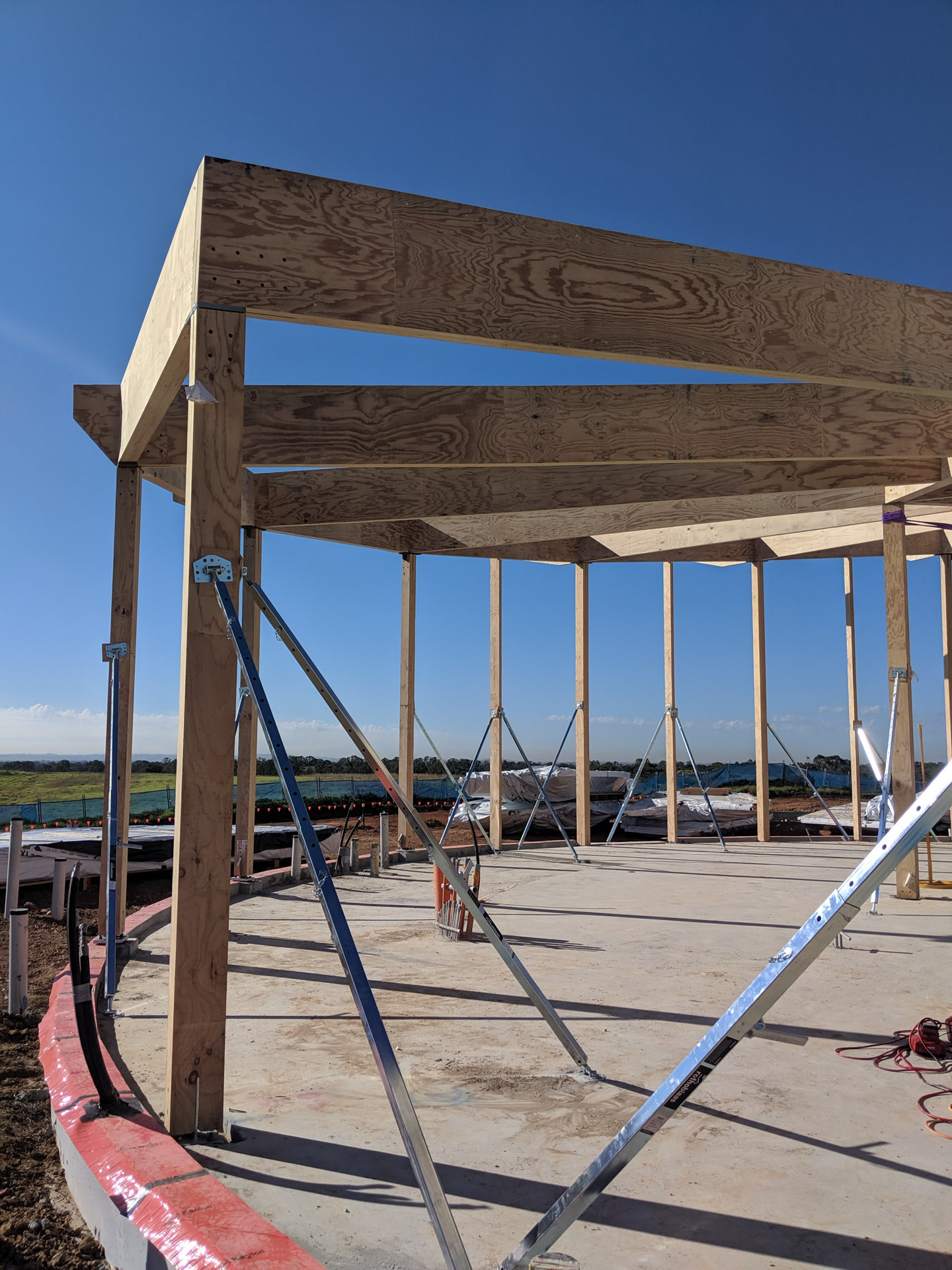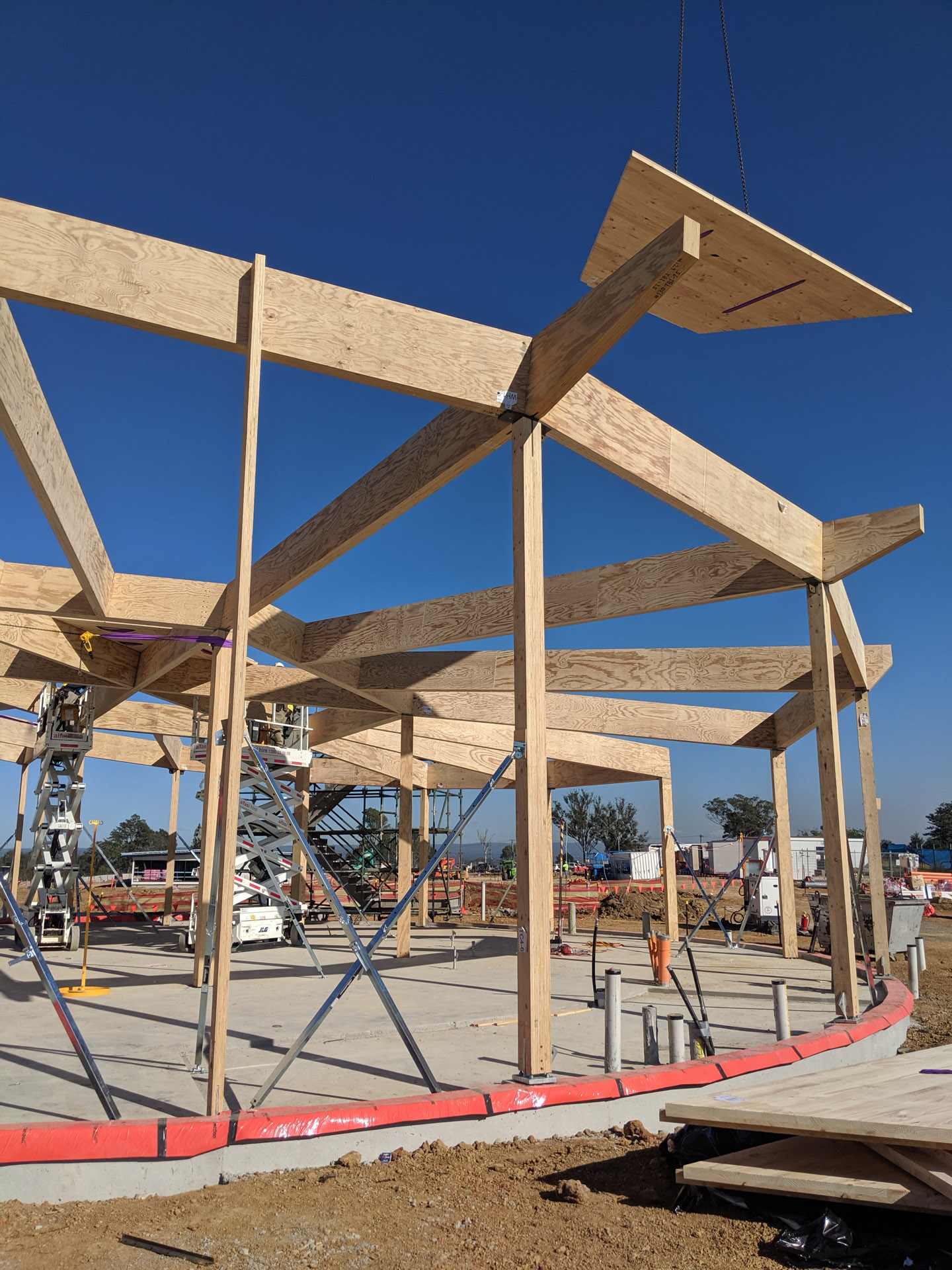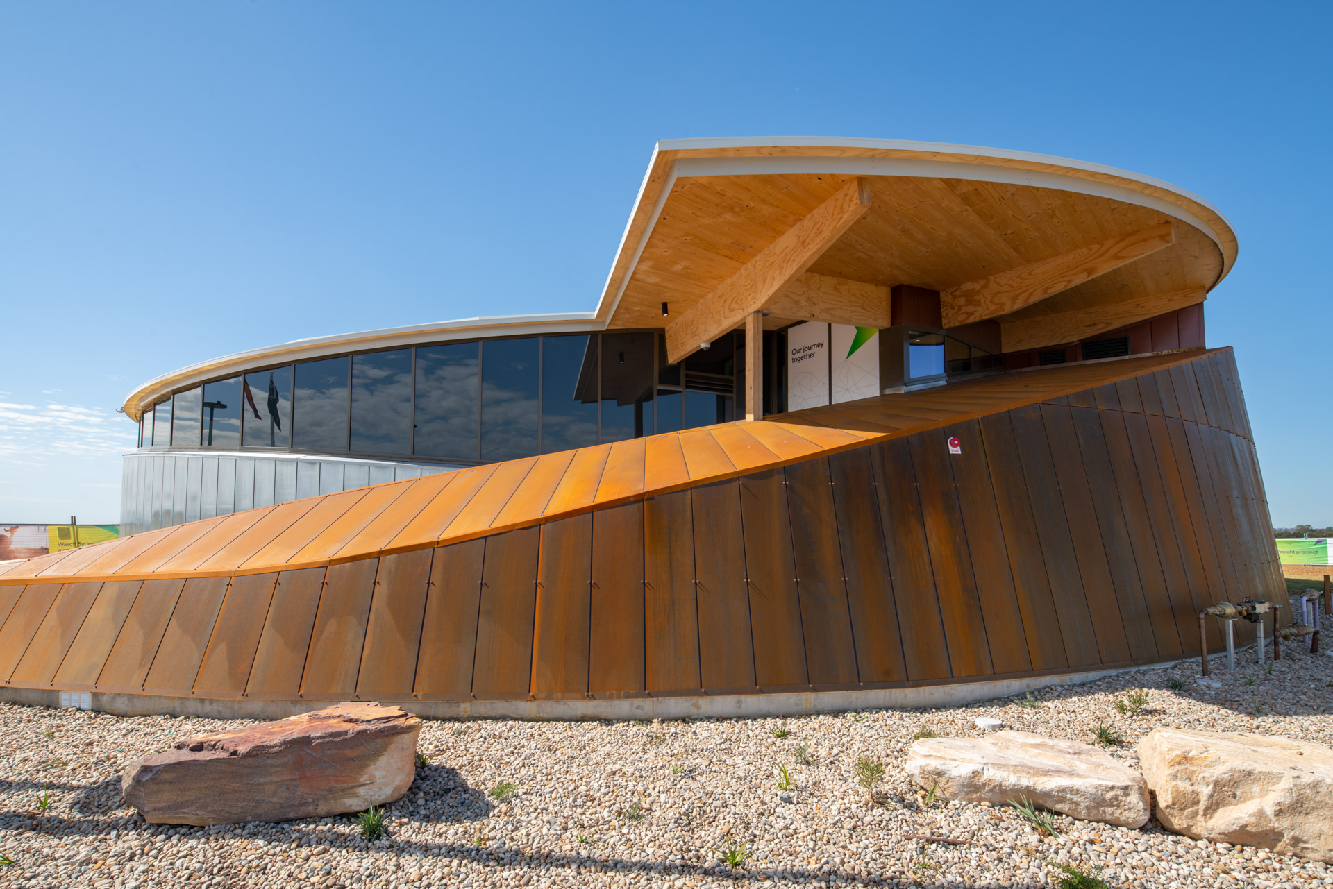 The building is a spiral in plan, with varying radii from a central point. This leads to the positioning of the main structural beams in a circular form and providing the large cantilevers to the front entrance of the building. The structure's post and beams are made of Laminated Veneer Lumber (LVL), overlaid with Cross Laminated Timber (CLT) roof panels.